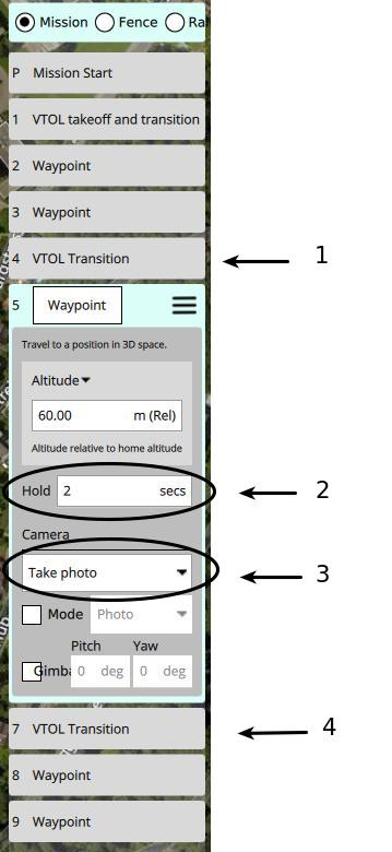 7. If the altitude of the drop zone was lowered (< 40m) then make sure the altitude is increased again before performing the transition to fixed wing mode. This can be done by placing an extra waypoint 2 meters after the payload drop waypoint with the correct altitude.