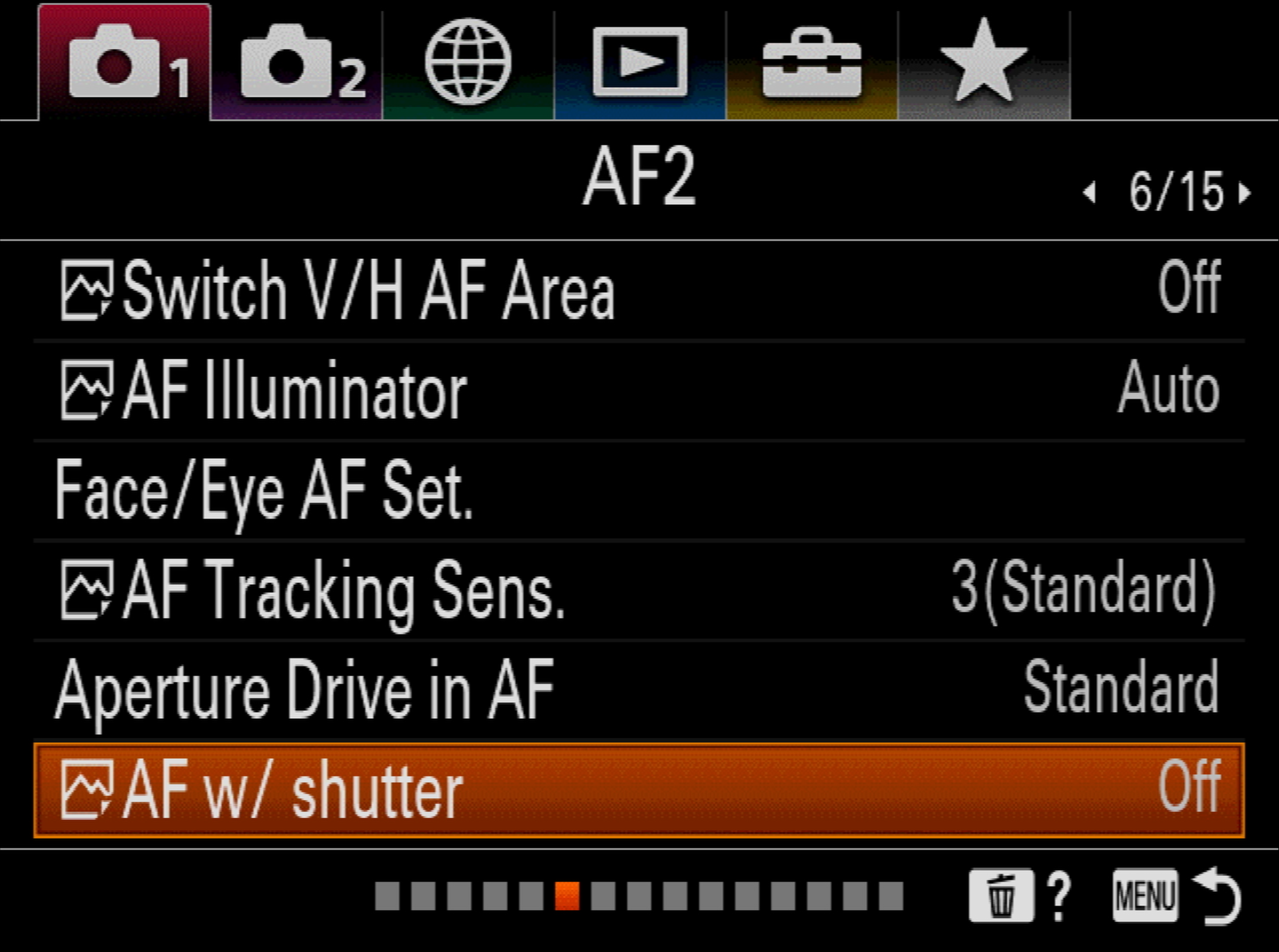 16. Set AF w/ shutter to "Off"