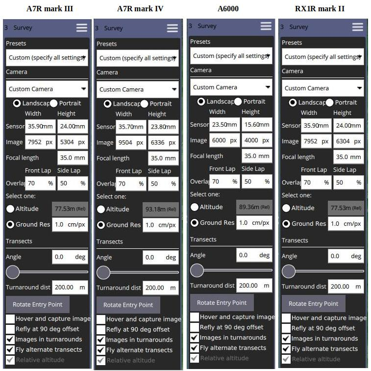 For the Agrowing A7R4 QUAD, a custom camera must be selected using the following settings: