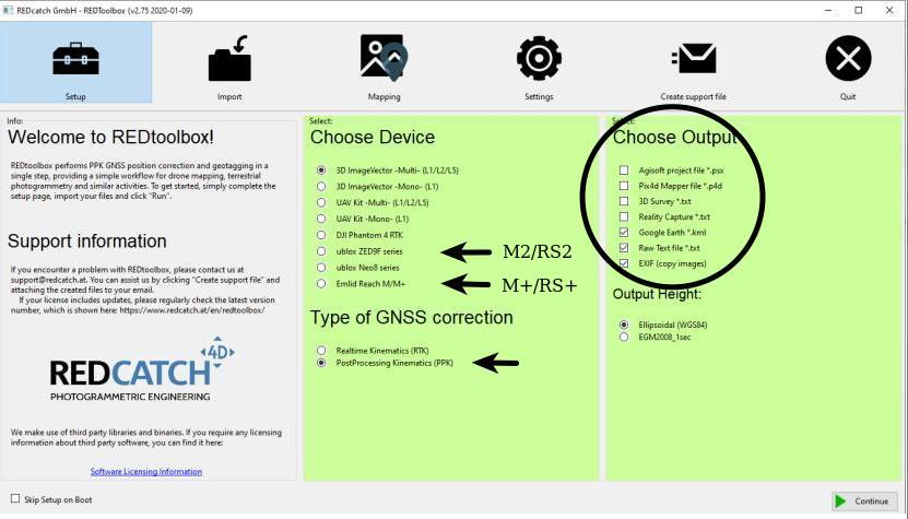 Step 3: Select the desired output for your post-processing option. Note that EXIF will work for virtually any platform but it is a slow process. For Agisoft or Pix4D we recommend using the designated outputs.<br>