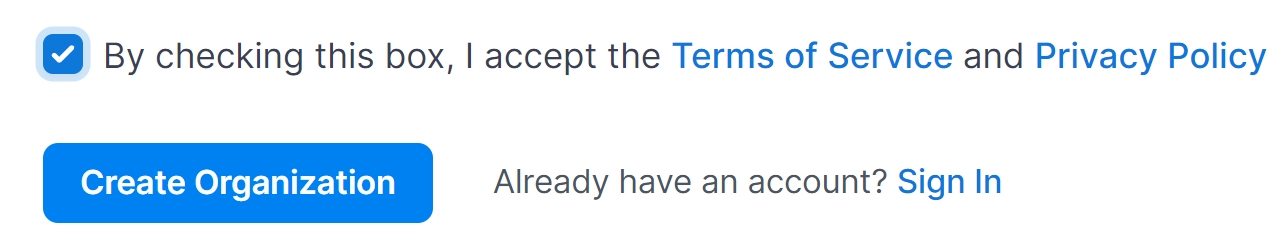Accept the Terms of Service and Privacy Policy by checking the box. Continue by clicking on Create Organization.