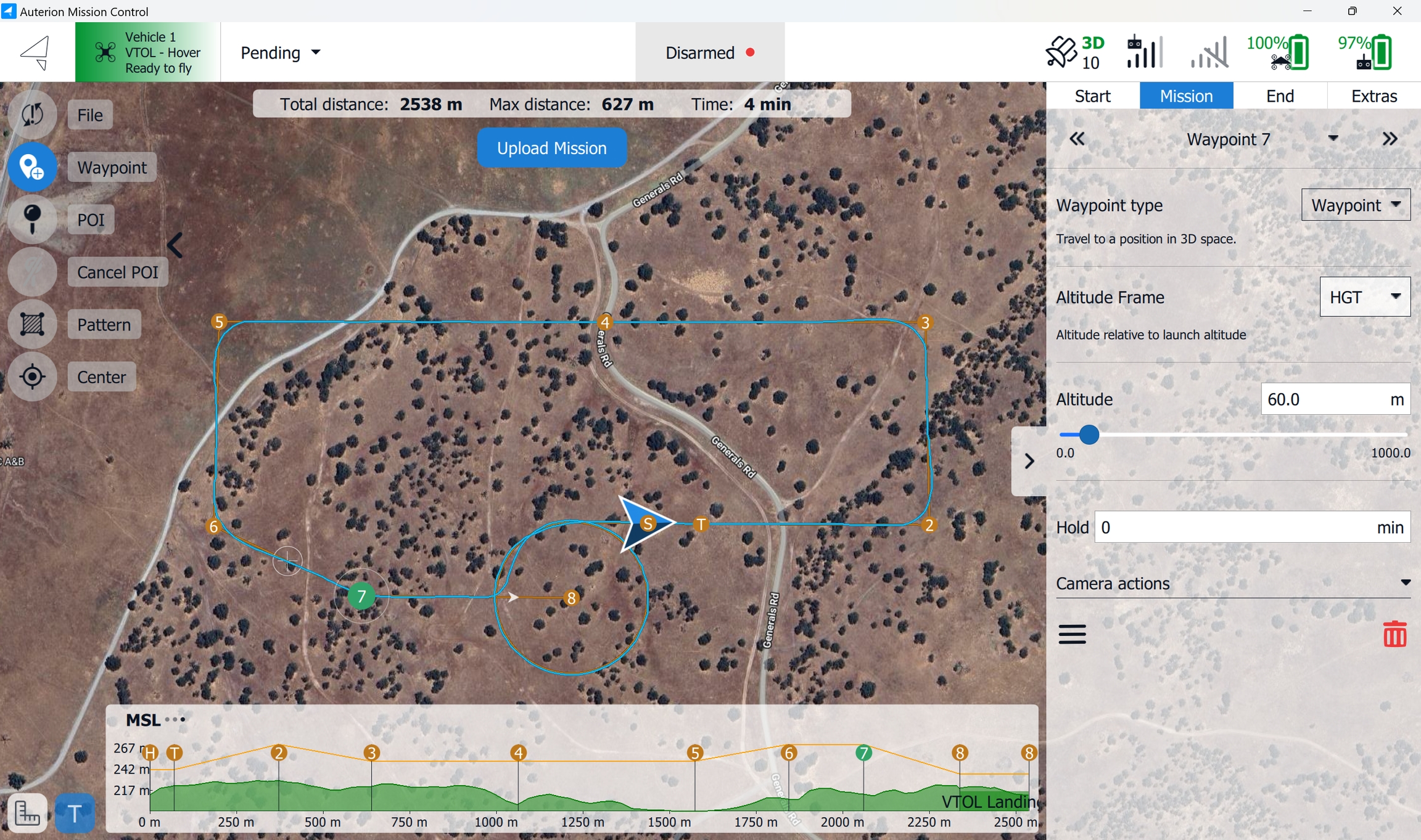 To use the APDS, a mission plan must be created. Plan a VTOL Takeoff and Transition, along with Intermediate Waypoints, up to the location where you wish to open de APDS doors. Please review the instructions for planning a VTOL Takeoff, Transition, and Intermediate Waypoints.