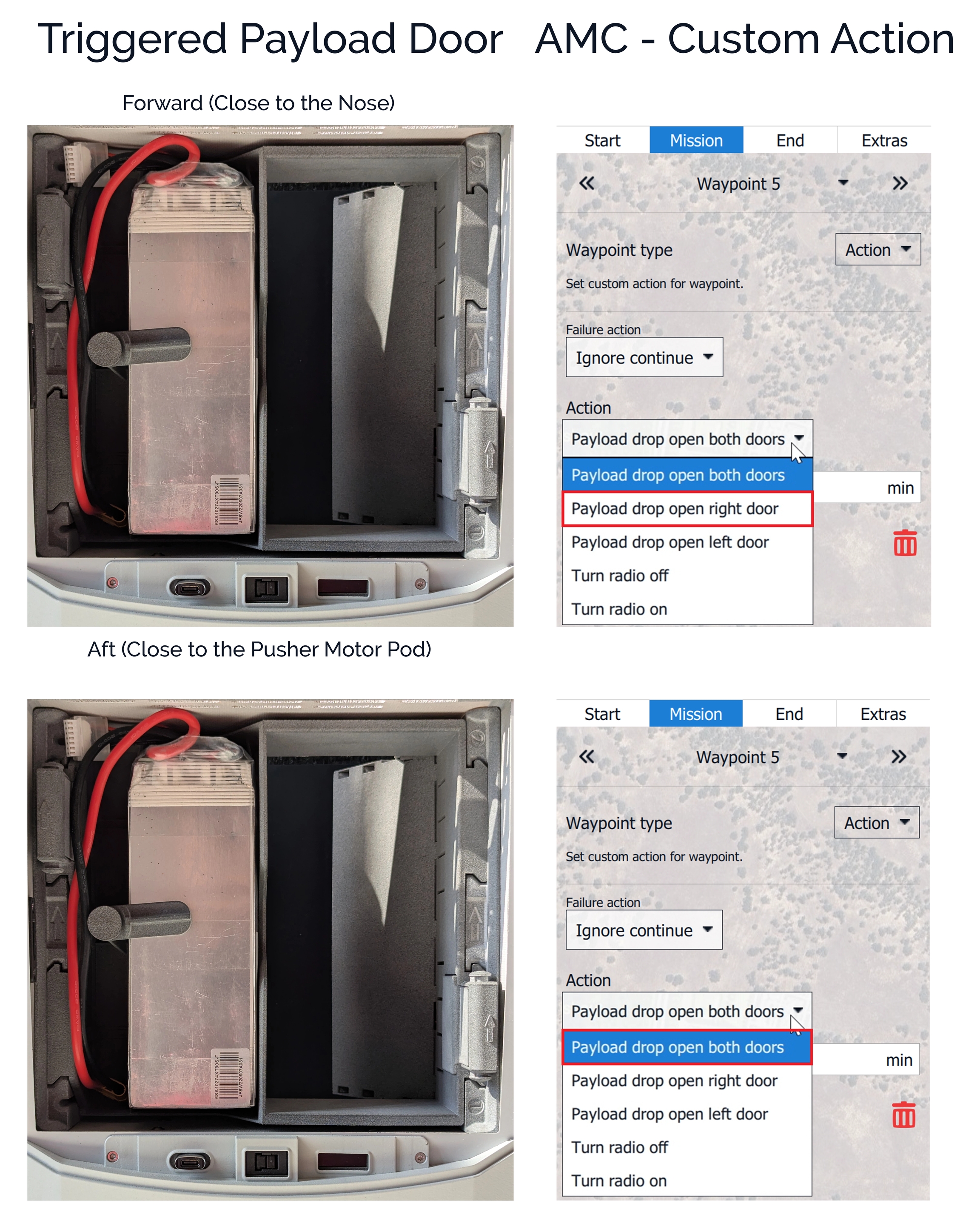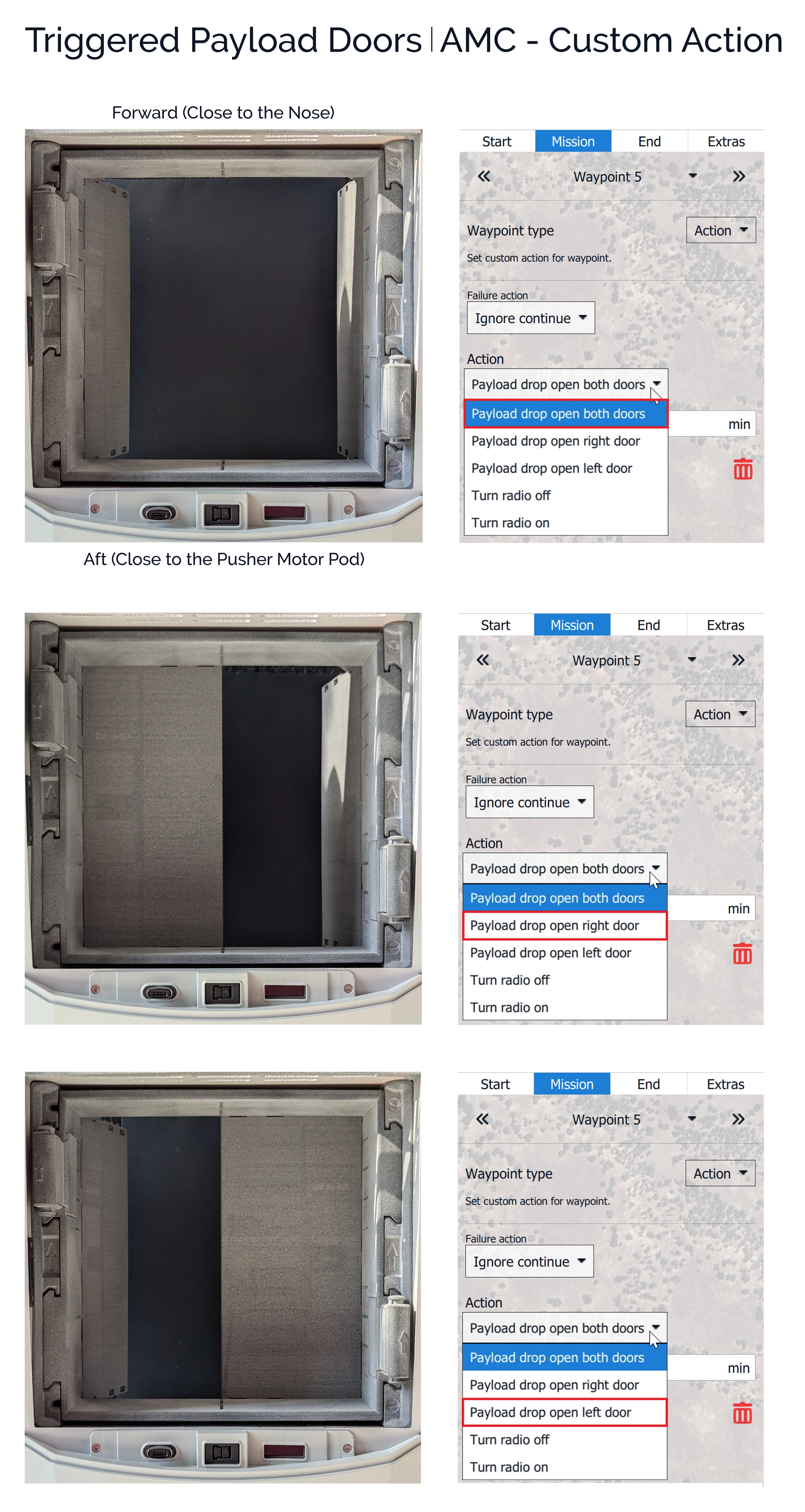 In the Mission Editor, the Action tab is available on the right side of the screen. When you click on it, a drop-down menu will appear. Select Payload drop open both doors.