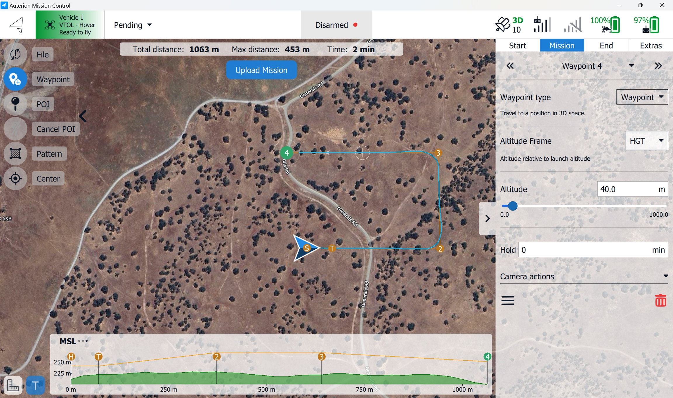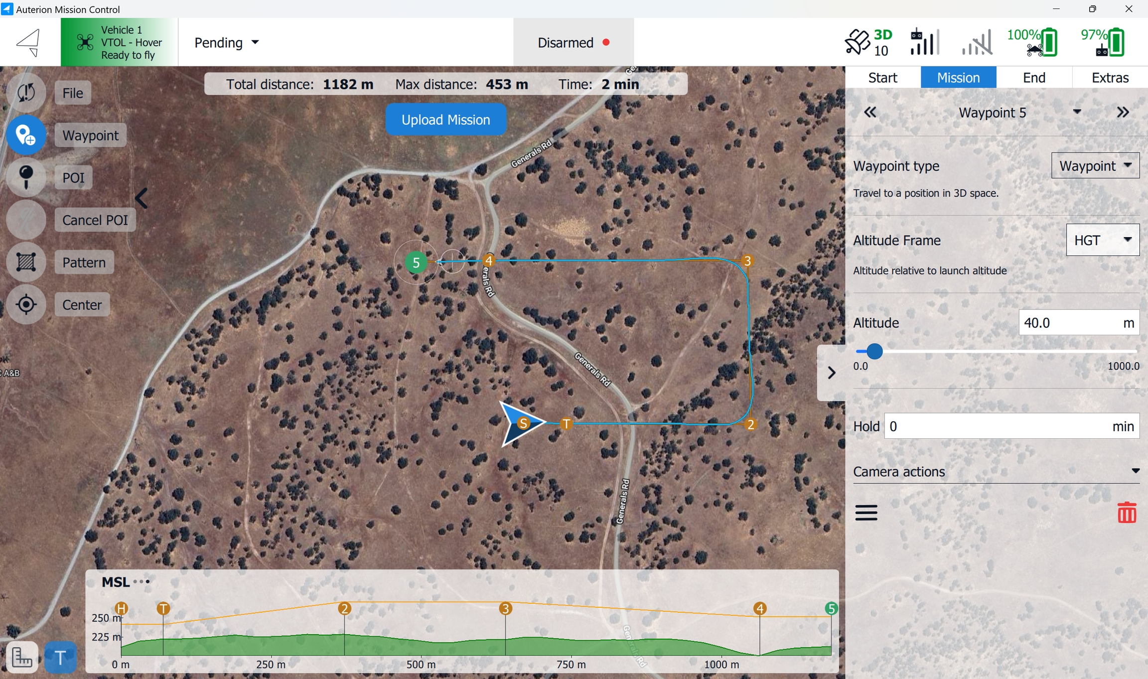 Waypoint 4 has an altitude of 40 meters. For improved precision, waypoints 3 and 5 can also be planned at the same altitude. This allows the vehicle to maintain a consistent altitude before and after the drop, aiding in the precision of the drop.
