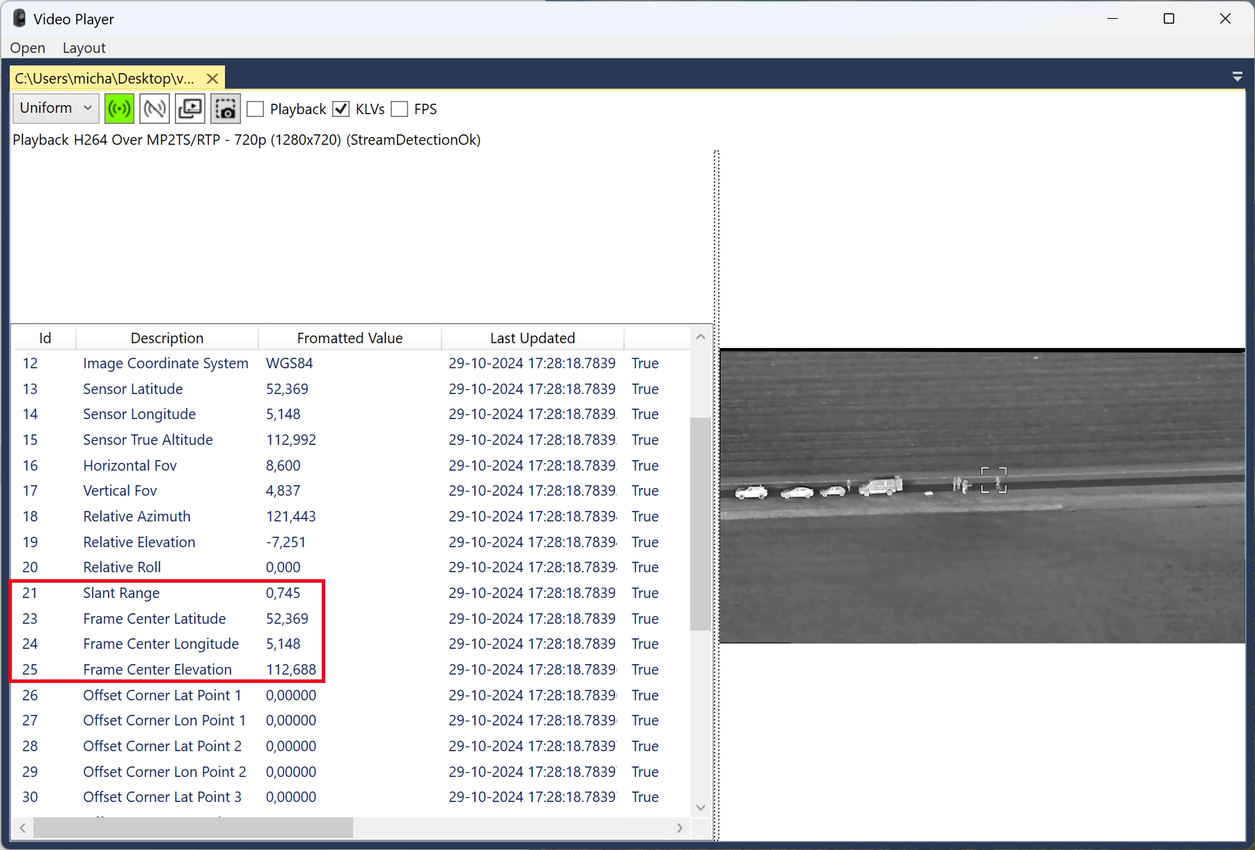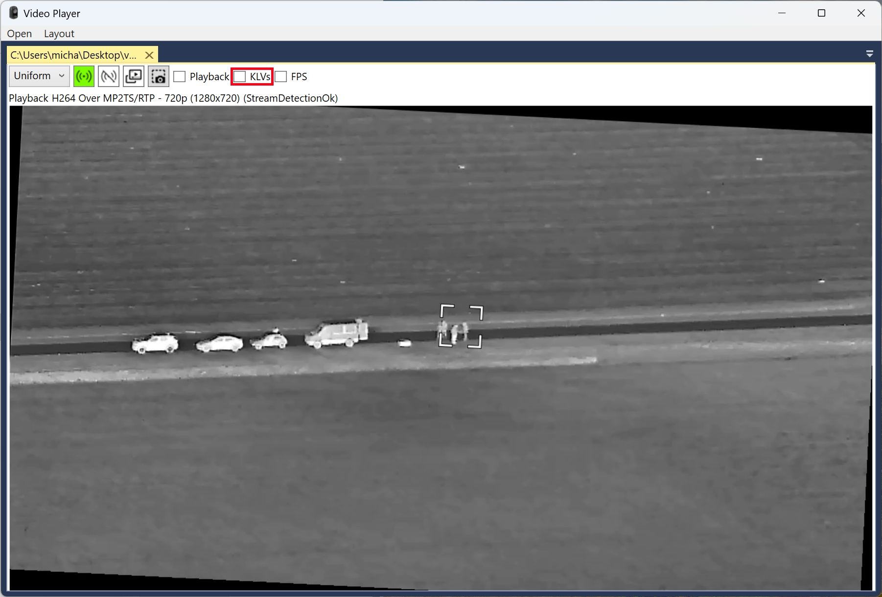 The selected video will be displayed in the video player. Enable the KLVs option to display the video's metadata.