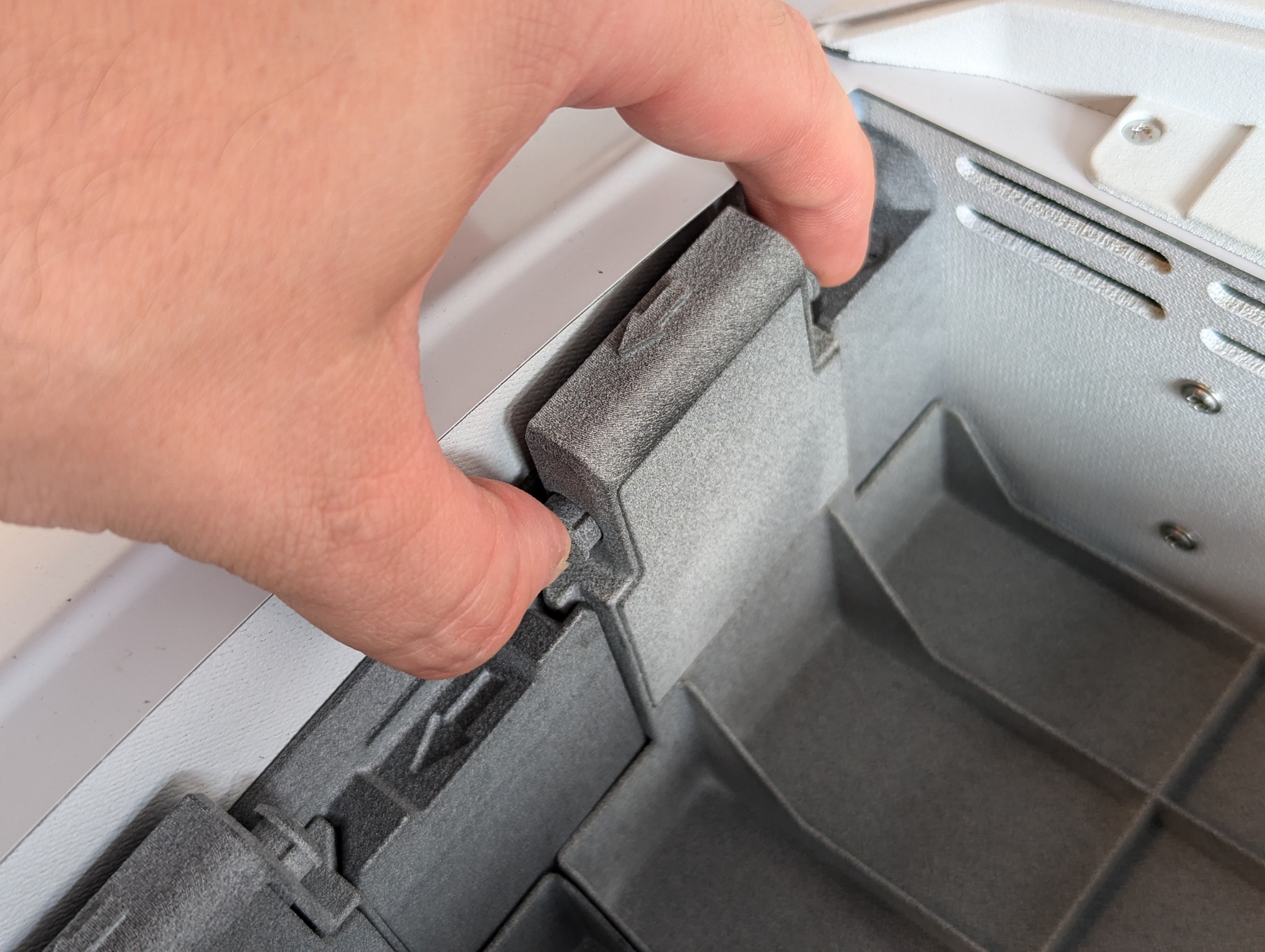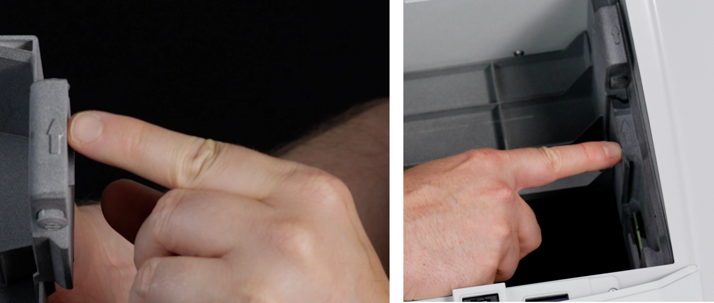 Each payload box has handles with two locking pins positioned opposite each other. To remove the payload box, grasp the handles with both hands, press the locking pins inward, and pull the payload box out.