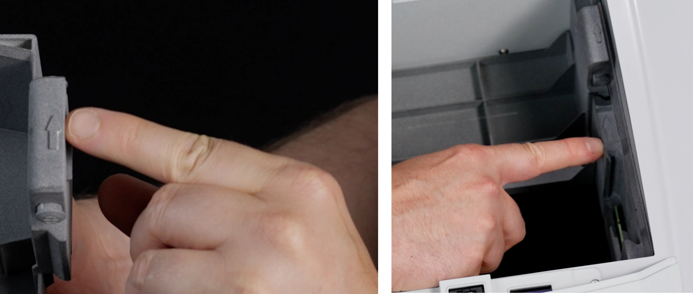 Each payload box has handles with two locking pins positioned opposite each other. To remove the payload box, grasp the handles with both hands, press the locking pins inward, and pull the payload box out.