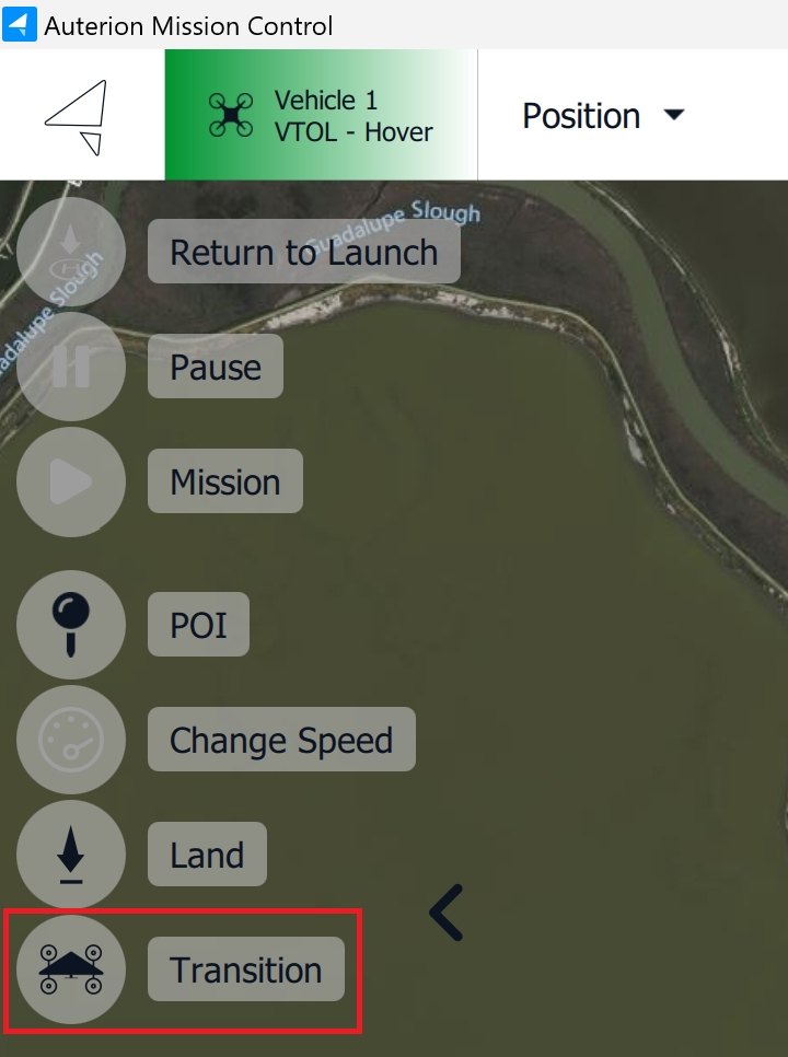 When in Position mode and the vehicle is aligned with its nose into the wind, verify for the last time that the transition path is free of obstacles, then issue the transition command.