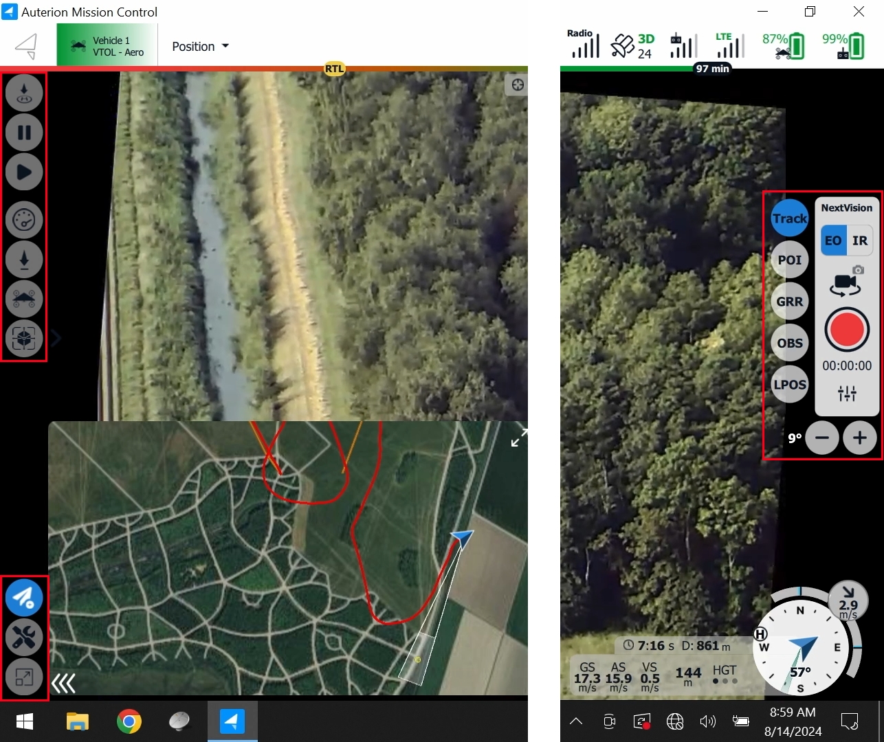 Video Feed is the Primary View: Payload controls, if applicable (in this example, ISR payload), are available on the right side of the screen, while Fly Tools (selection), Flight, and Map Tools are accessible on the left side.