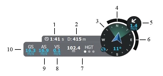 Compass (includes vehicle heading, camera field of view, and direction towards the Ground Control Station)