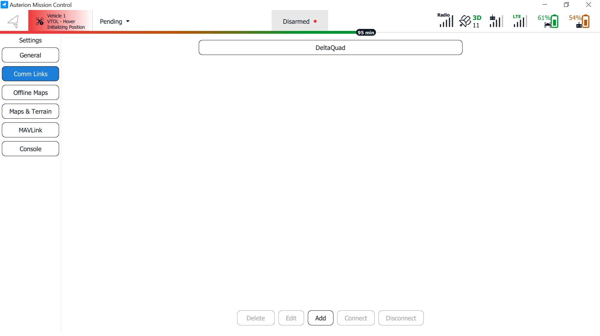 The Comm Links feature enables you to manually create and connect to communication links. To add a new Comm Link, simply click the Add button. This menu is relevant when connecting a Secondary Control Terminal or when connecting to the Auterion Suite to use the simulator.