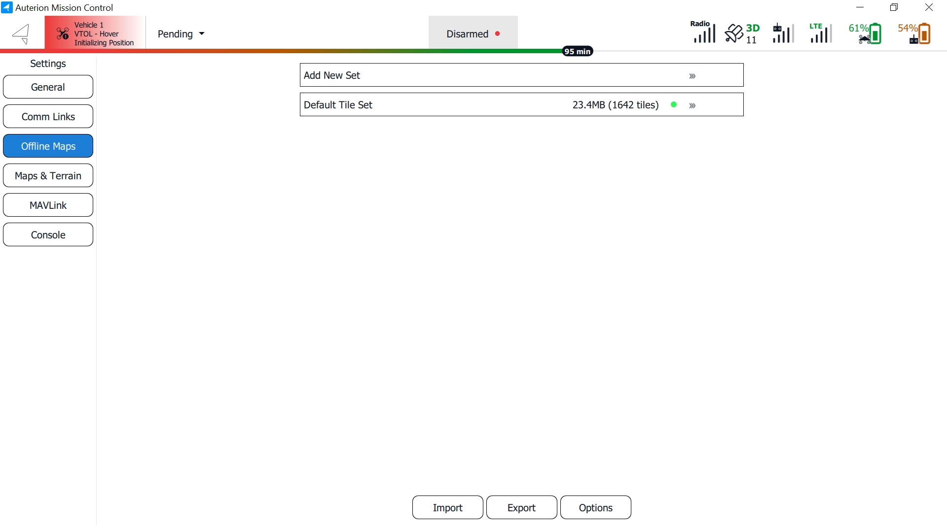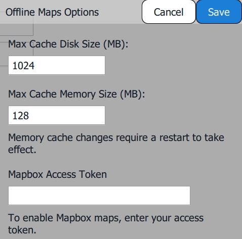 At the bottom of the screen, options to import and export map data are available. Options provide additional caching choices and allow you to enter the Mapbox Access Token.