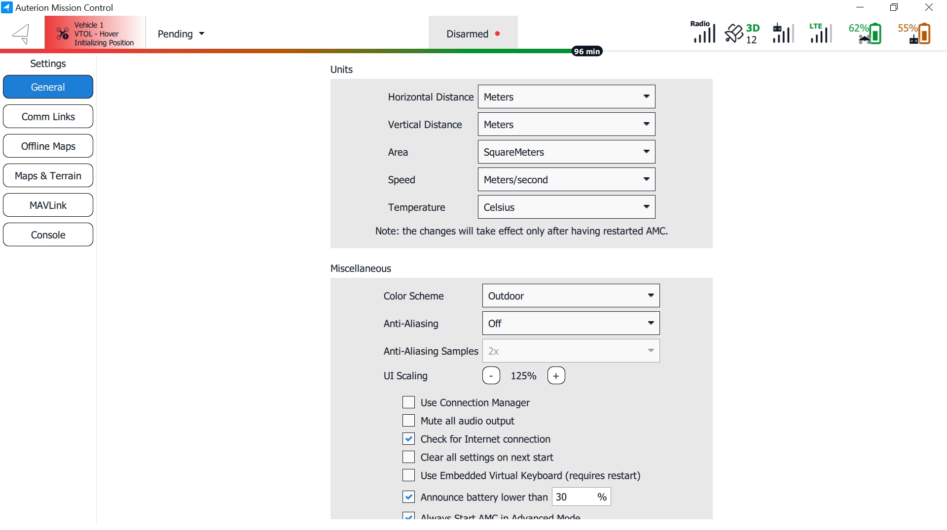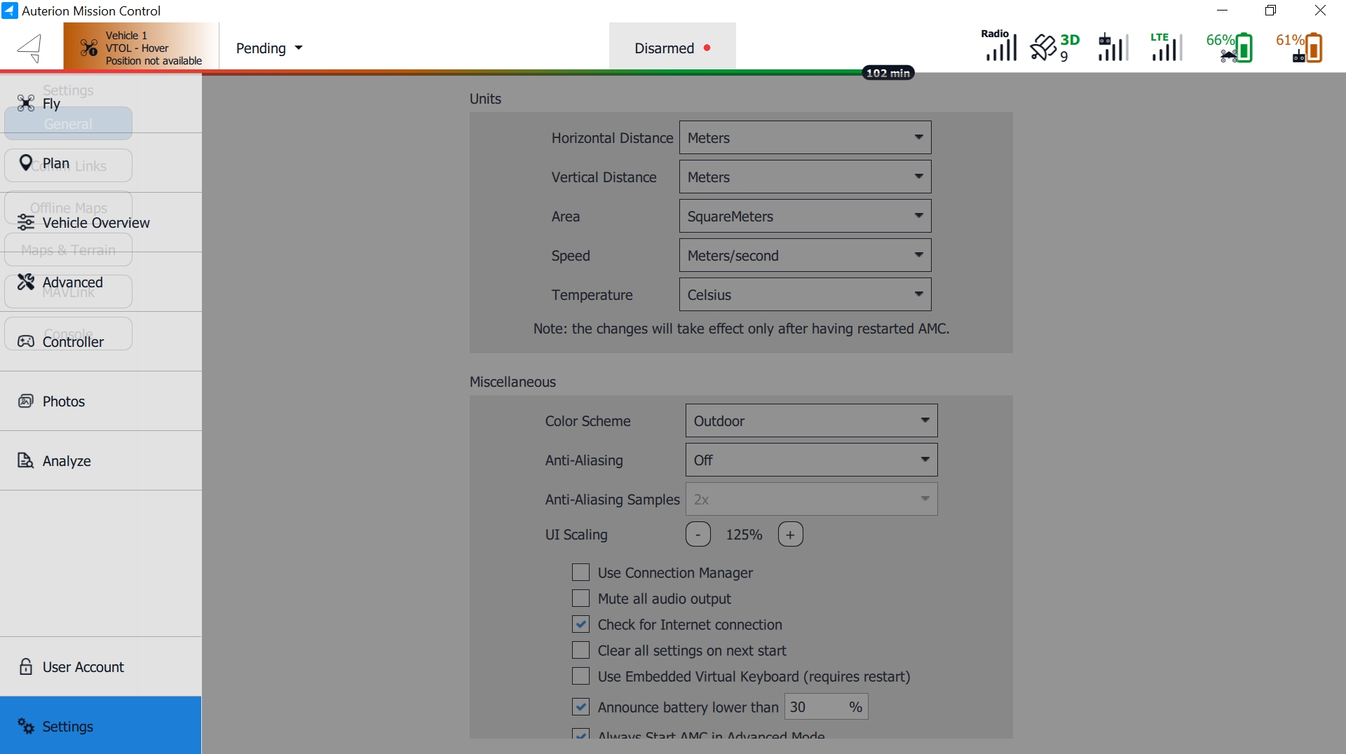The General Settings serve as the primary location for application-level configuration. Configurable options include display units, miscellaneous settings, fly view settings, plan view settings, and storage. These values can be adjusted even when no vehicle is connected. Settings that require a vehicle restart are indicated in the user interface.