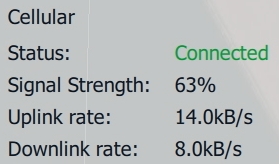 The bars represent the cellular signal strength. When selecting the icon, more information becomes available, such as Status, Signal Strength in %, Uplink rate, and Downlink rate.