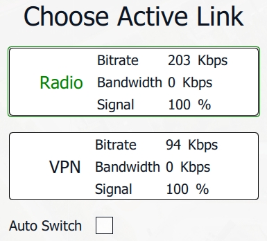 When you click on the Radio icon, you'll be given the option to switch between the Radio link and the VPN link. Click on your preferred link. The active link will be outlined in green and displayed in the Top Bar. (For the VPN link to work, the vehicle must have a sufficient LTE connection, and the GCS must be connected to the internet via a hotspot or Wi-Fi network.)