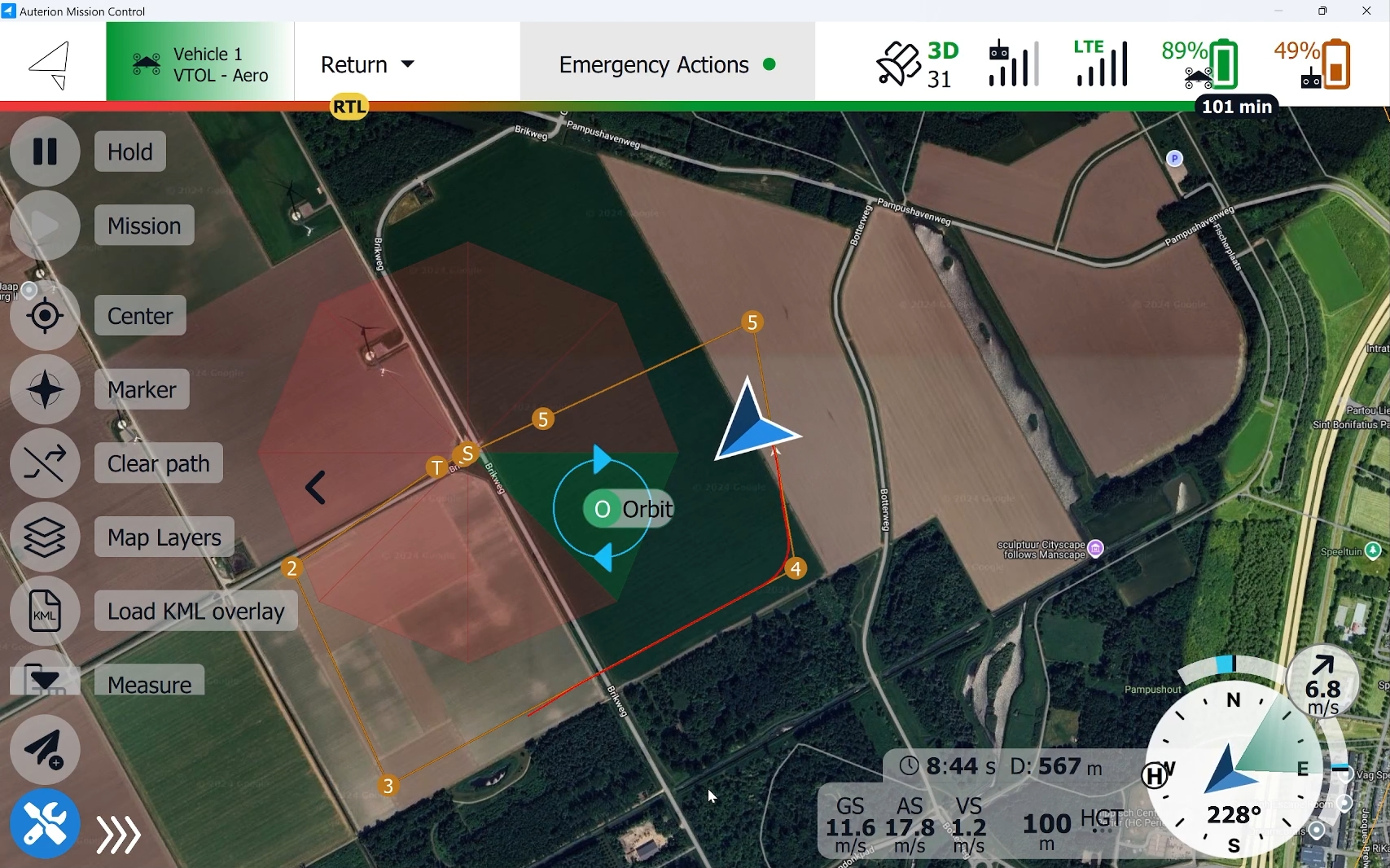 The DeltaQuad Evo will place the loiter-down orbit within the selected sectors, descend to the set landing altitude, exit the orbit in the direction of the landing location, transition, and land in multirotor mode at the planned location.