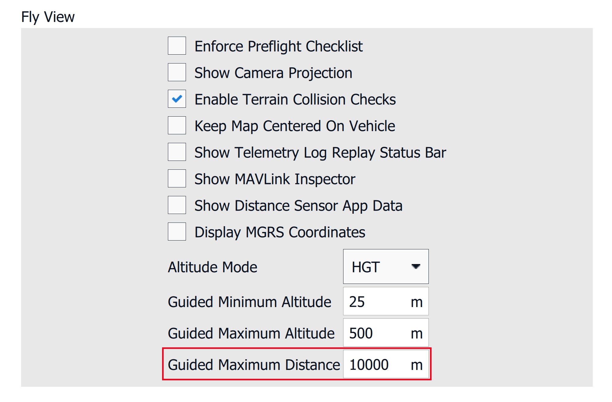 The Guided Maximum Distance can be changed in AMC Menu -> Settings -> Fly View.