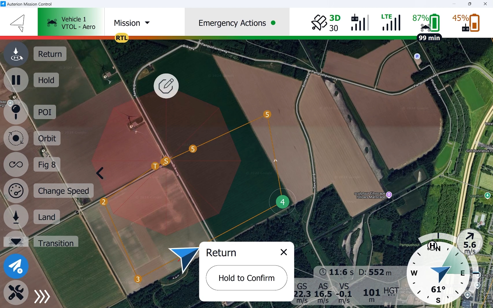 In addition to the planned Landing Pattern, the operator can select available approach sectors in the octagon for landing during a Return command. When the Return command is initiated, the red octagon appears around the takeoff location.