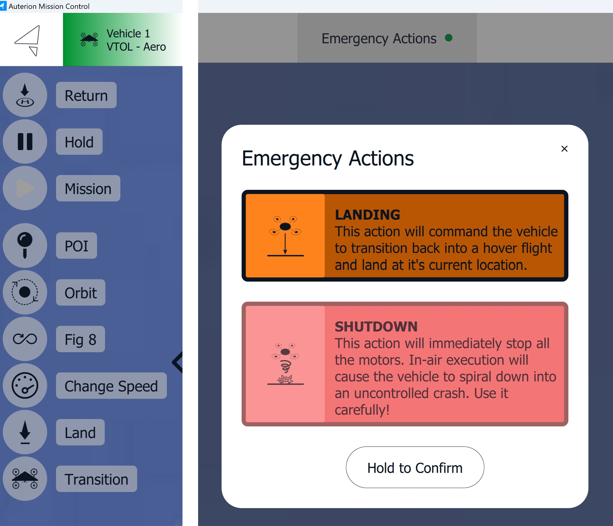 During operation, the vehicle can be commanded using the Fly and Flight Tools on the left side of the screen, as well as the Emergency Actions from the top menu bar.