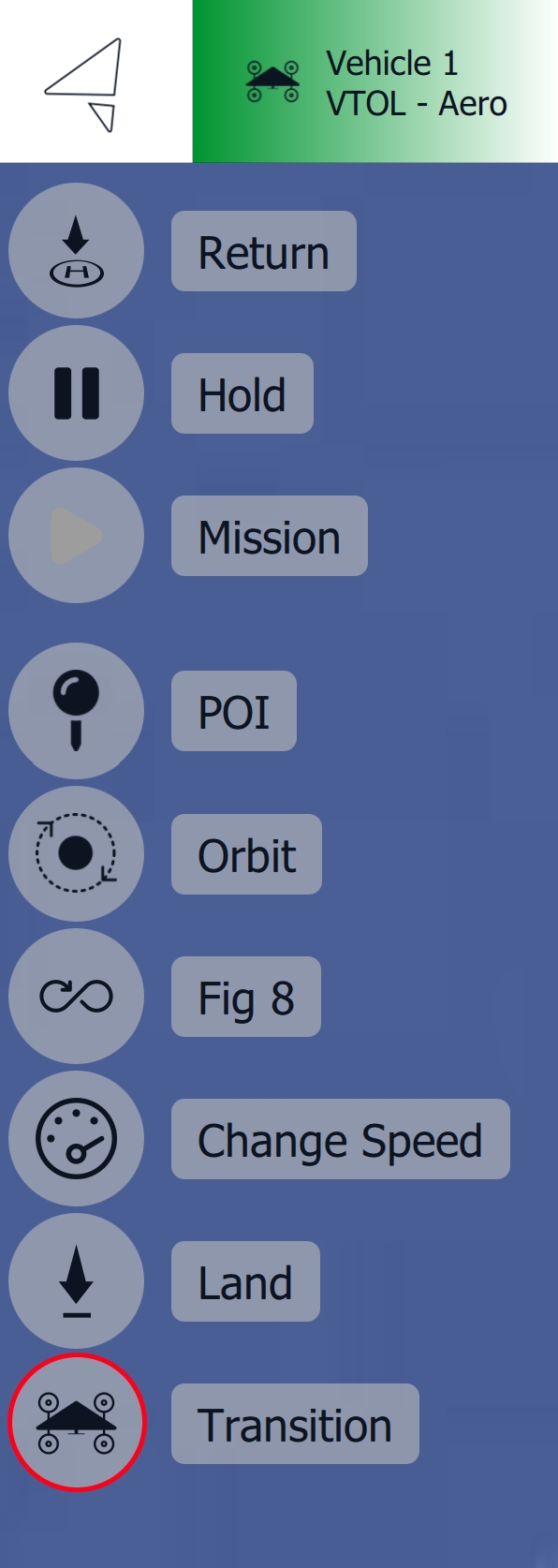 The Transition Command toggles between the VTOL modes of the vehicle. When the vehicle is flying in fixed-wing mode, it switches to multirotor mode, and vice versa.