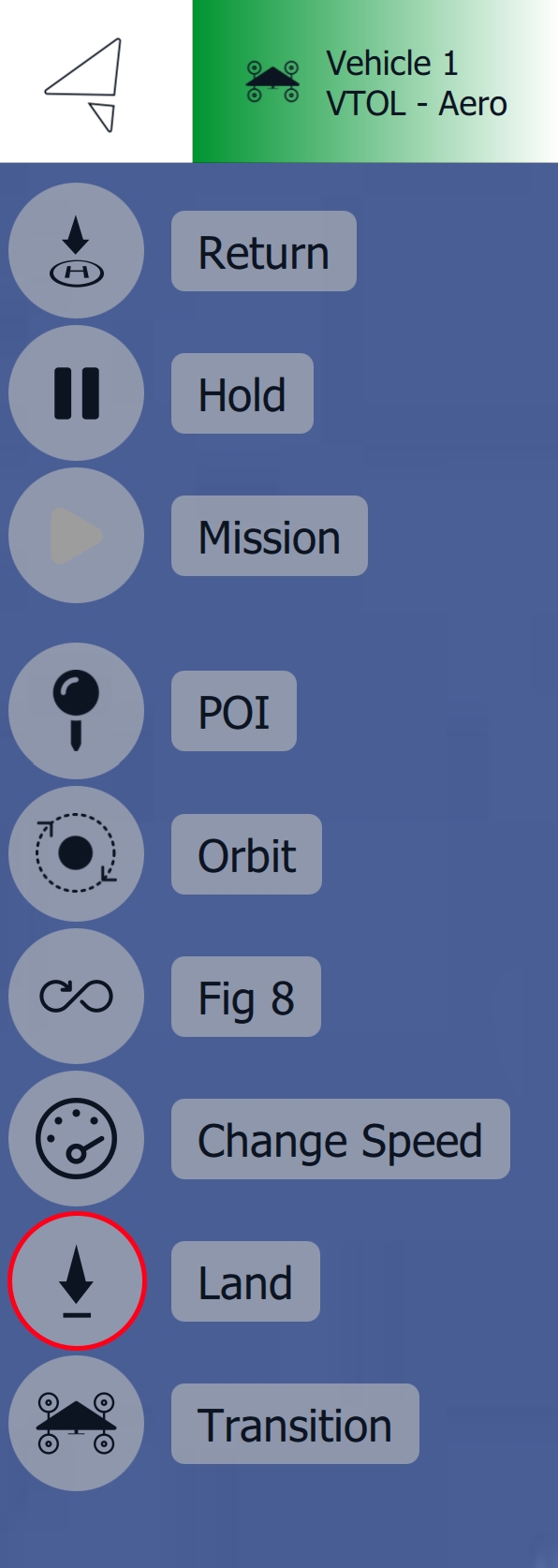 LANDING will land the vehicle immediately at its current location. When the vehicle is in fixed-wing mode, it will first transition to multirotor mode and start its descent.