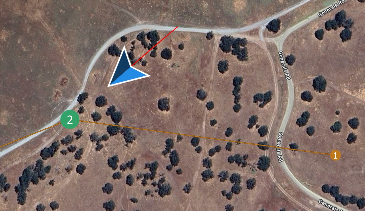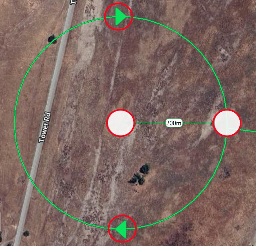 Click and hold the outer white vertex to adjust the orbit's radius by dragging it left or right (minimum radius is 100 meters, maximum radius is 2000 meters).