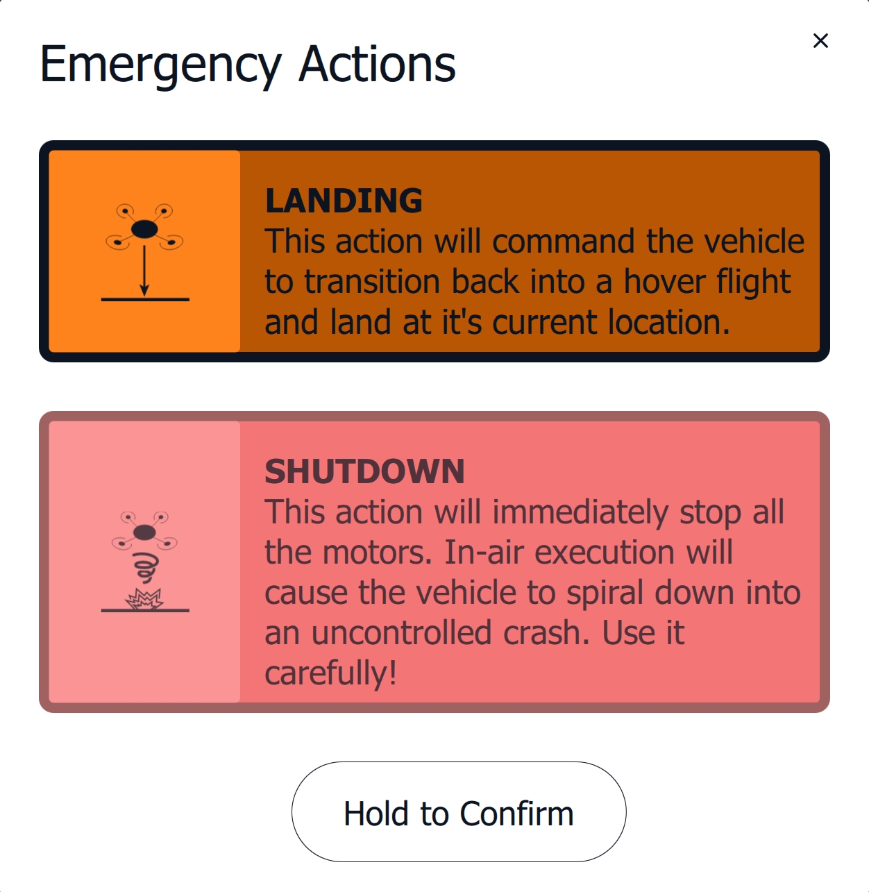 SHUTDOWN will stop all motors IMMEDIATELY. This procedure should only be used while the vehicle is on the ground or as a last resort to avoid damage to people or property.