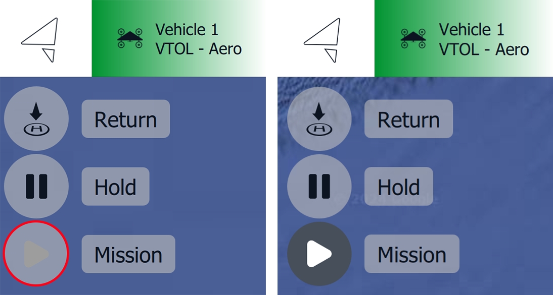 The Mission command becomes available once a mission plan is uploaded to the vehicle. After confirming the mission start, the vehicle will begin or resume the mission from the active waypoint (green). The active waypoint can be changed by clicking on the desired waypoint and confirming the new selection.