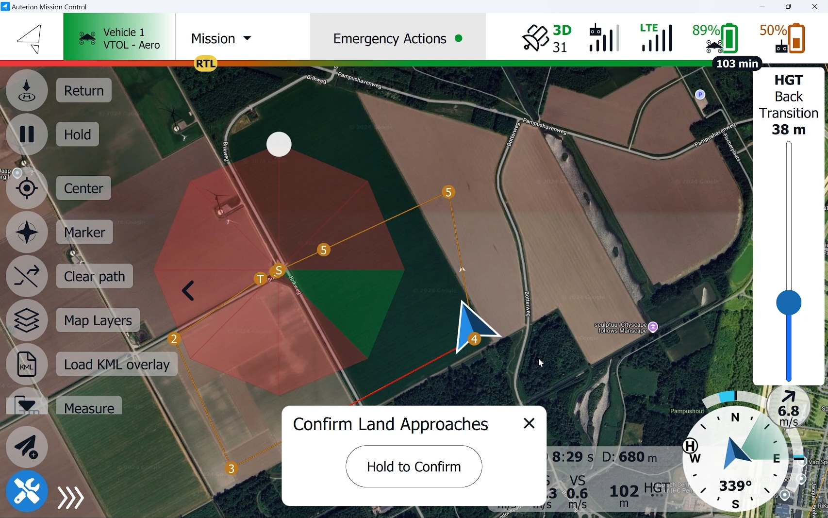 If at least one sector is selected and confirmed (green), the vehicle will place the loiter-down orbit within the selected sector(s), descend to the set Back Transition altitude, exit the loiter toward the landing location, perform a back transition upon reaching the takeoff location, and land in multirotor mode.