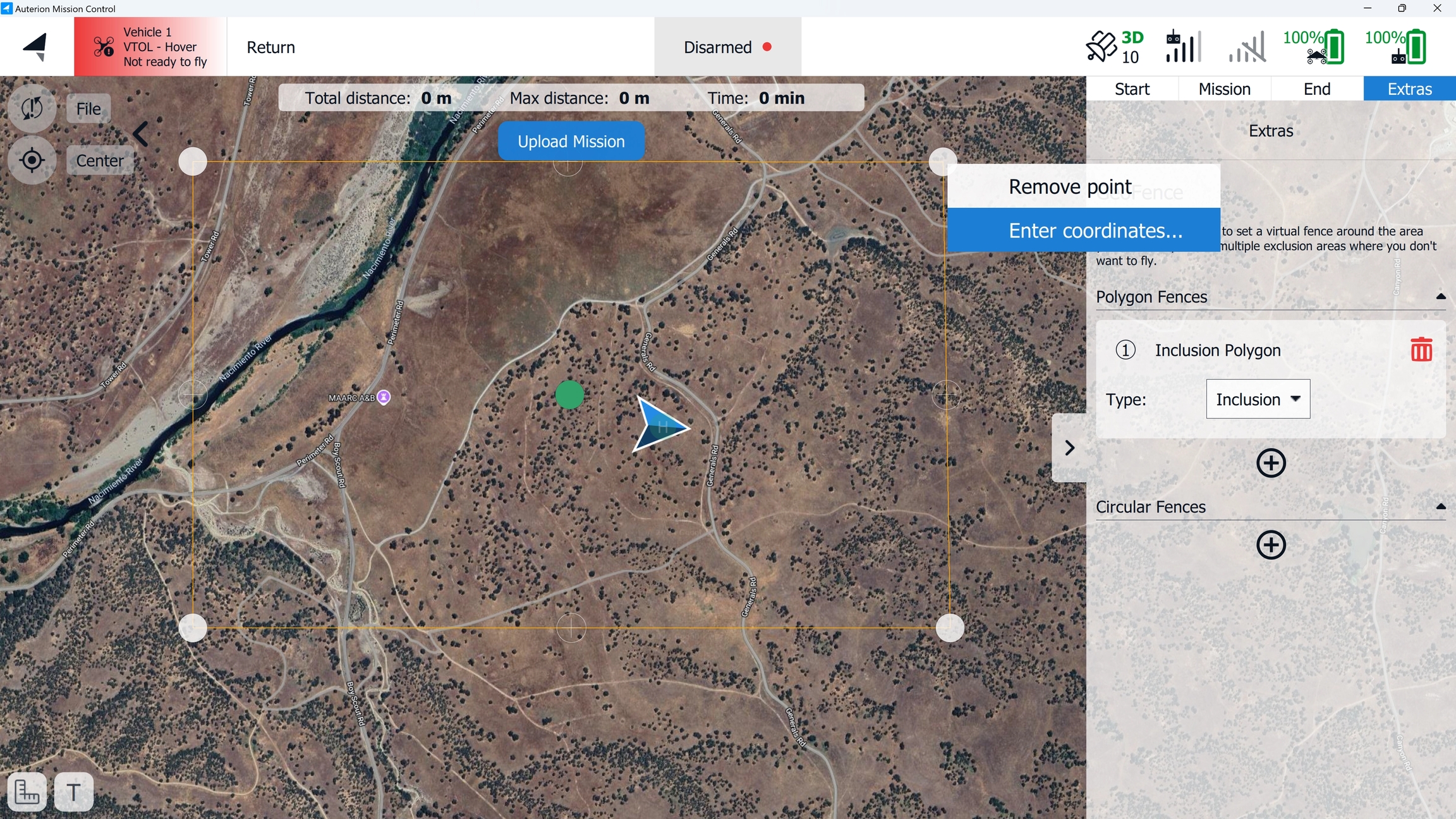 One or more geofences can be placed in the Plan View and uploaded to the vehicle. This is possible with or without a takeoff, waypoint, or landing item being present. This is beneficial when operating the vehicle with the Quick Takeoff functionality while requiring complex geofencing.