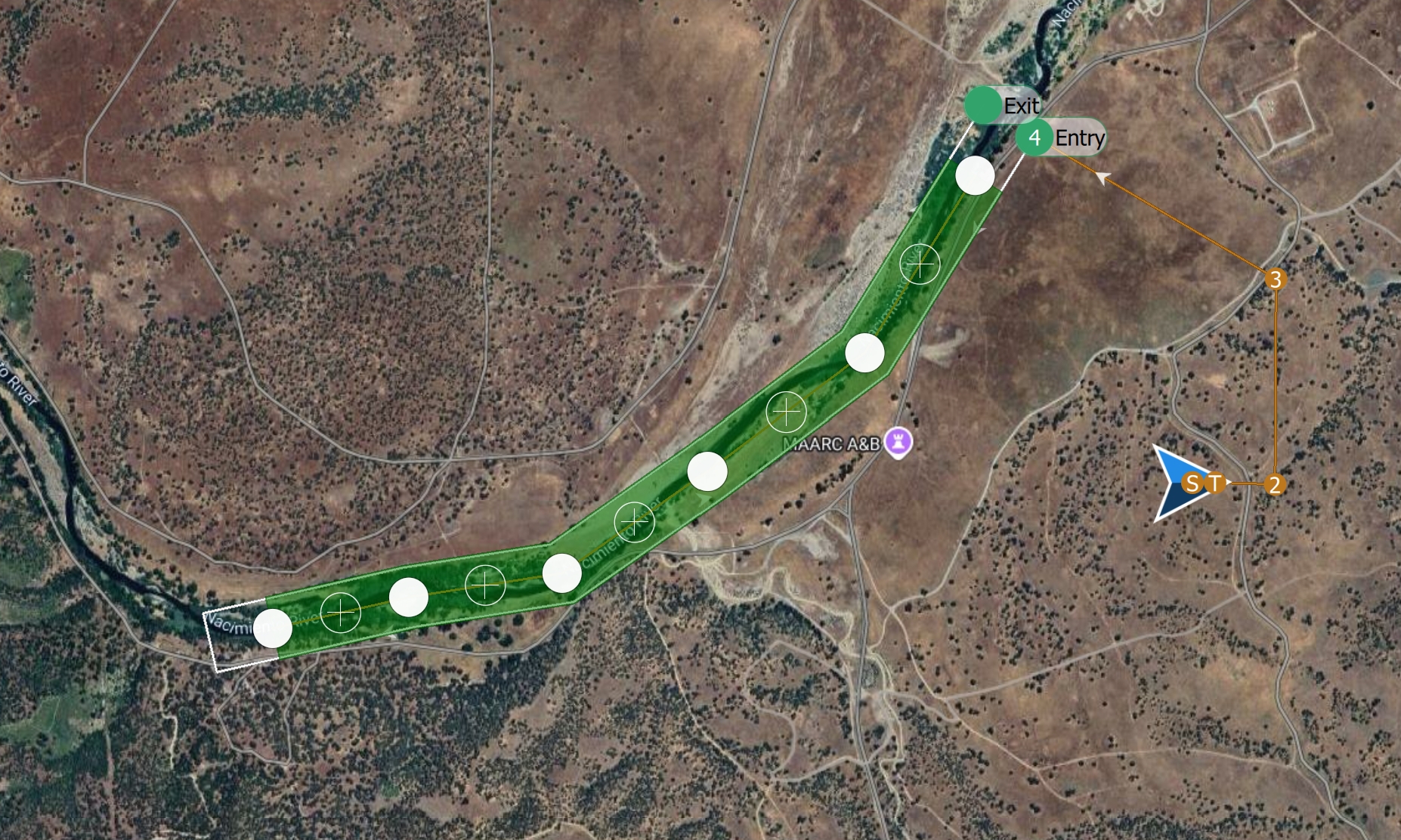 The Trace Tool lets the operator draw a Corridor Scan by clicking anywhere on the map. Use the vertices to shape the form and to reposition it. Clicking the plus sign in the green survey area adds additional vertices.