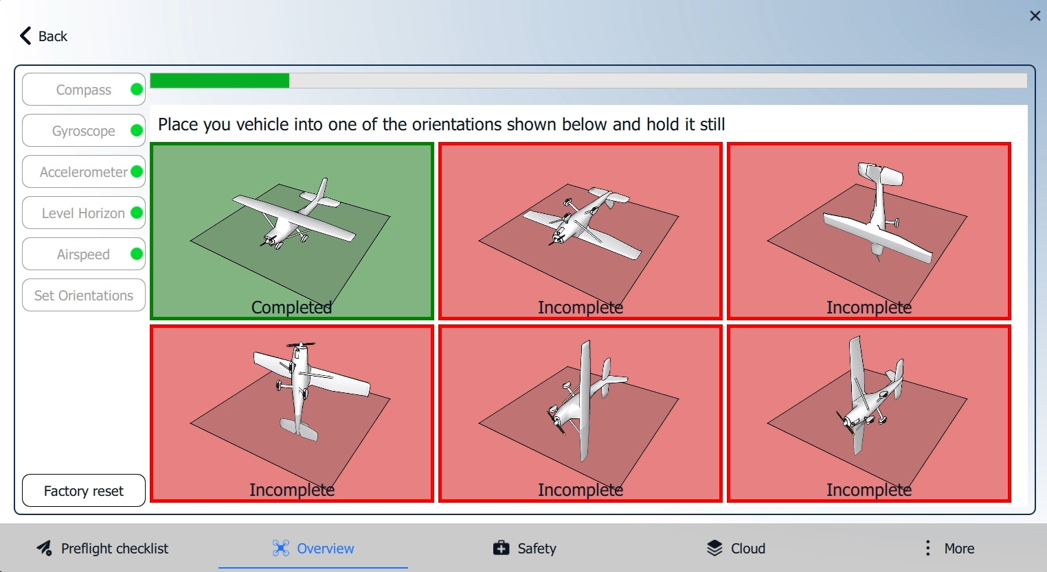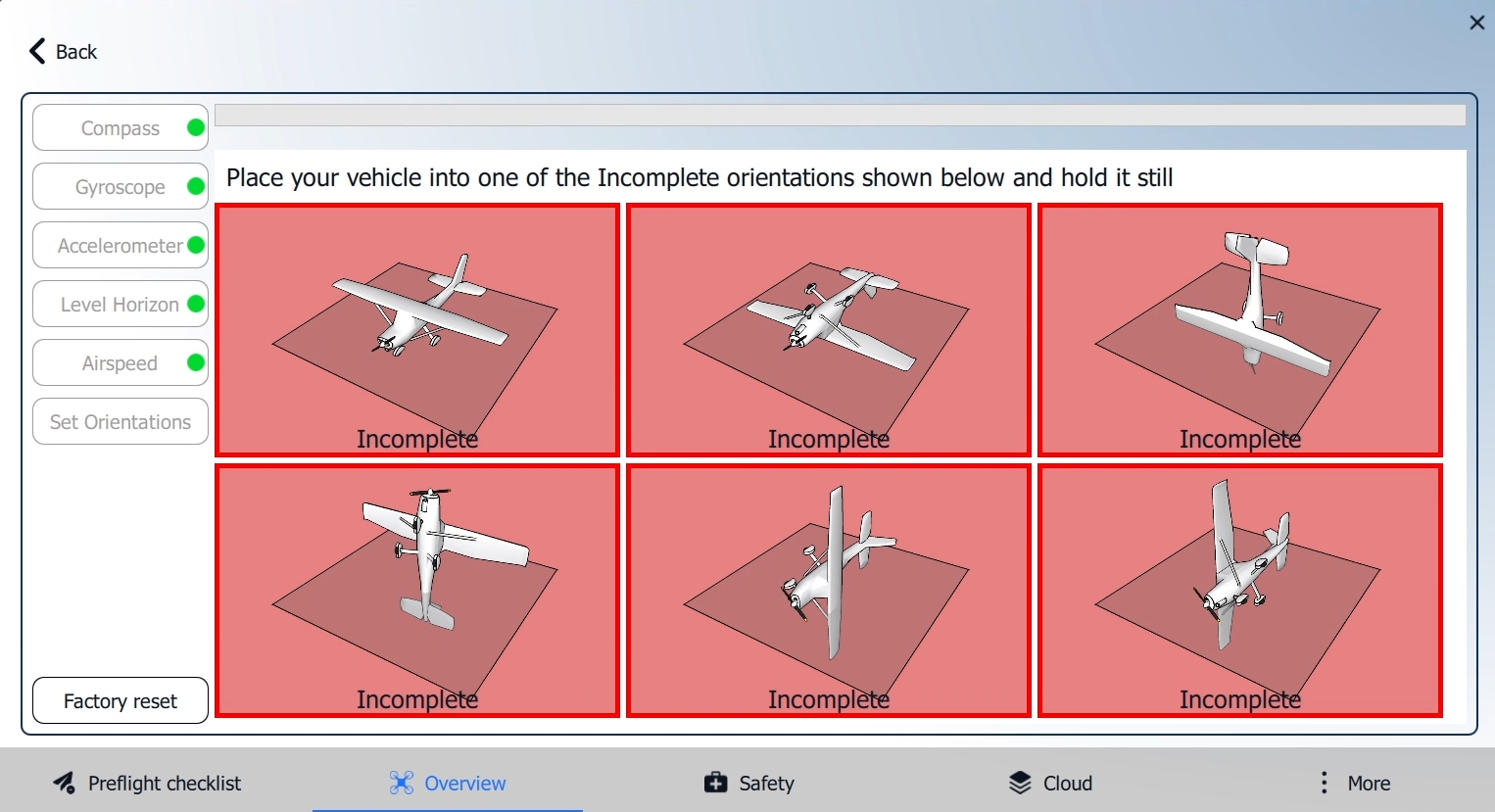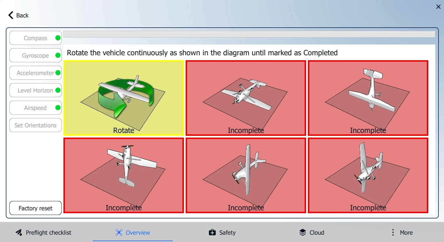 AMC will guide you in positioning the vehicle in a series of set orientations and then rotating it around the specified axis. Place the vehicle in any of the orientations shown in red (incomplete) and hold it still.