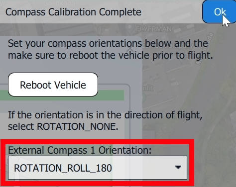 Once you've calibrated the vehicle in all positions, AMC will display a Compass Calibration Complete prompt. Verify the External Compass 1 Orientation.