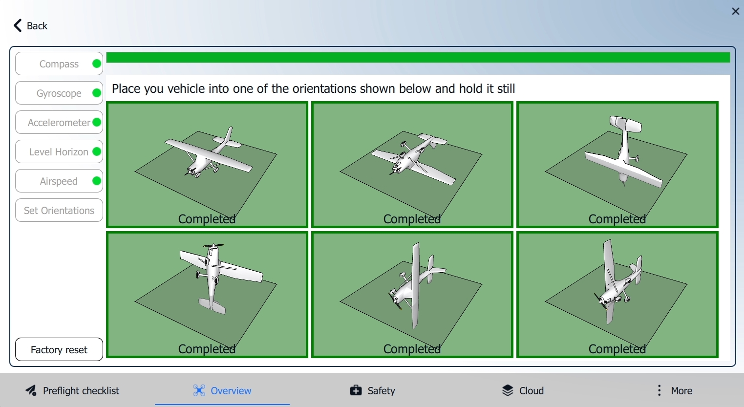 Repeat the calibration process for each vehicle orientation. At the end of the calibration, all orientation images will turn green, and the progress bar at the top will be full.