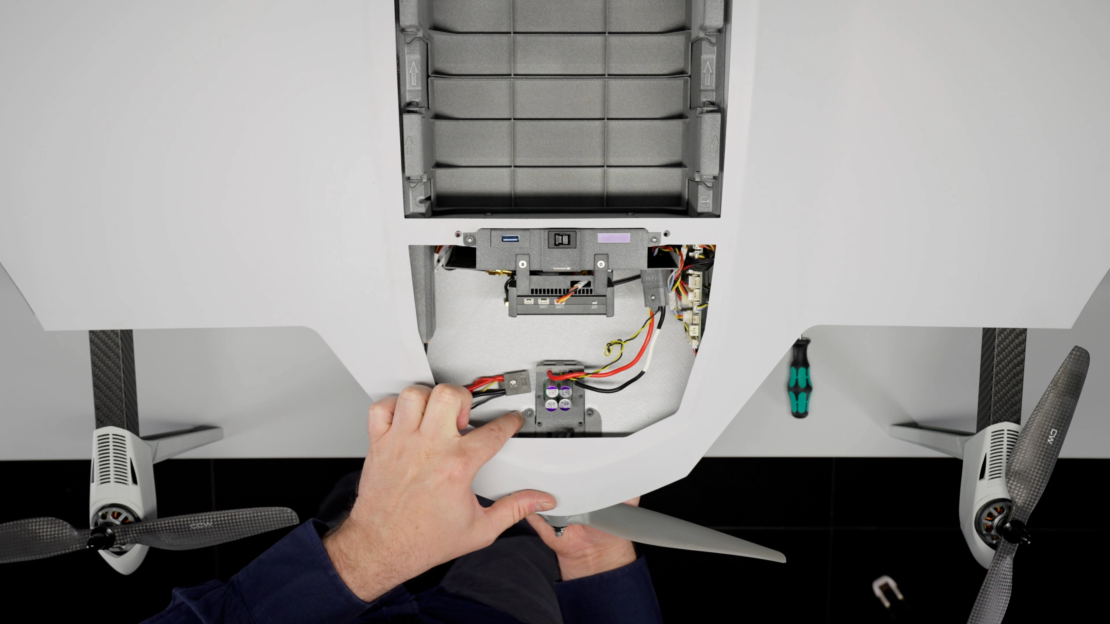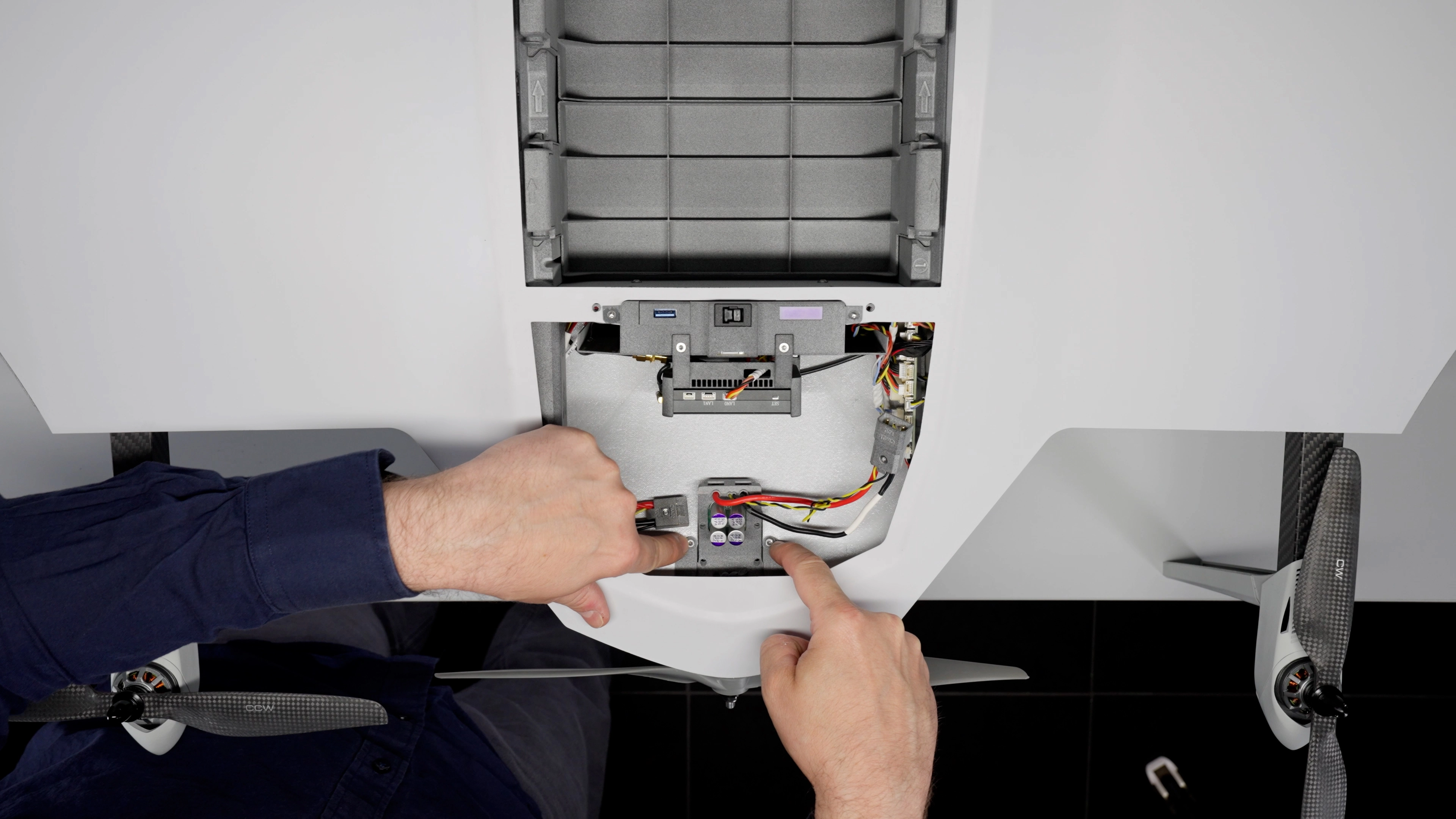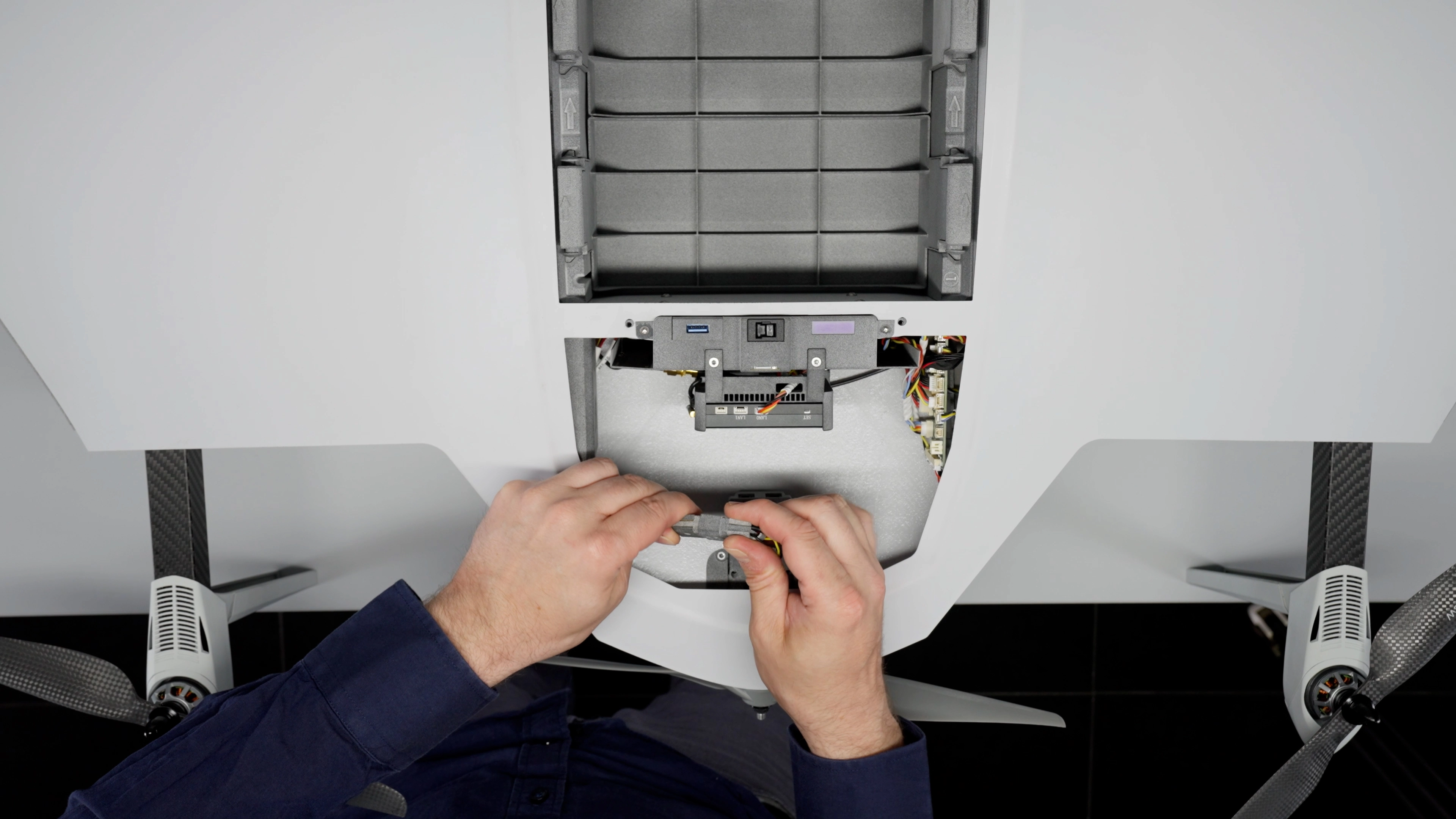 17. Connect the Pusher Motor Pod connectors and store the cable in the lower left corner of the fuselage.