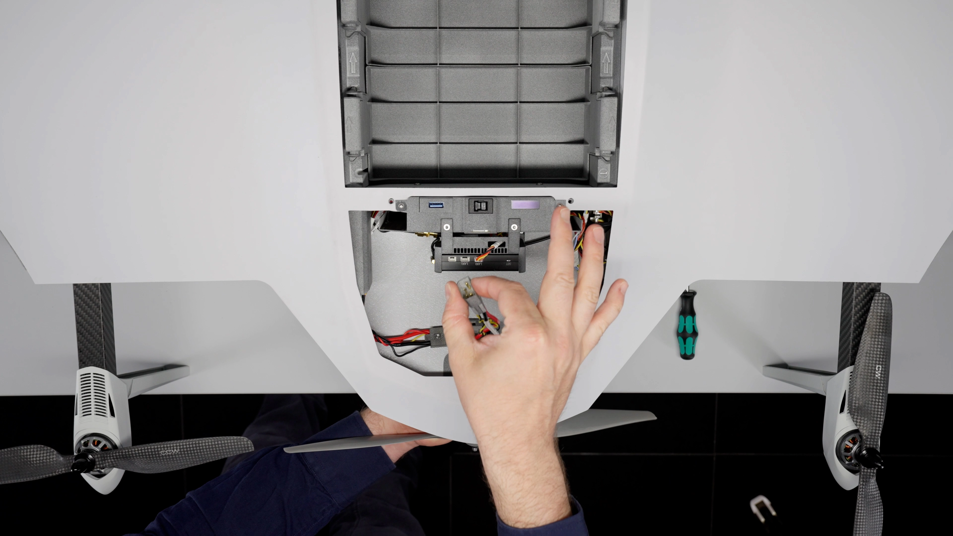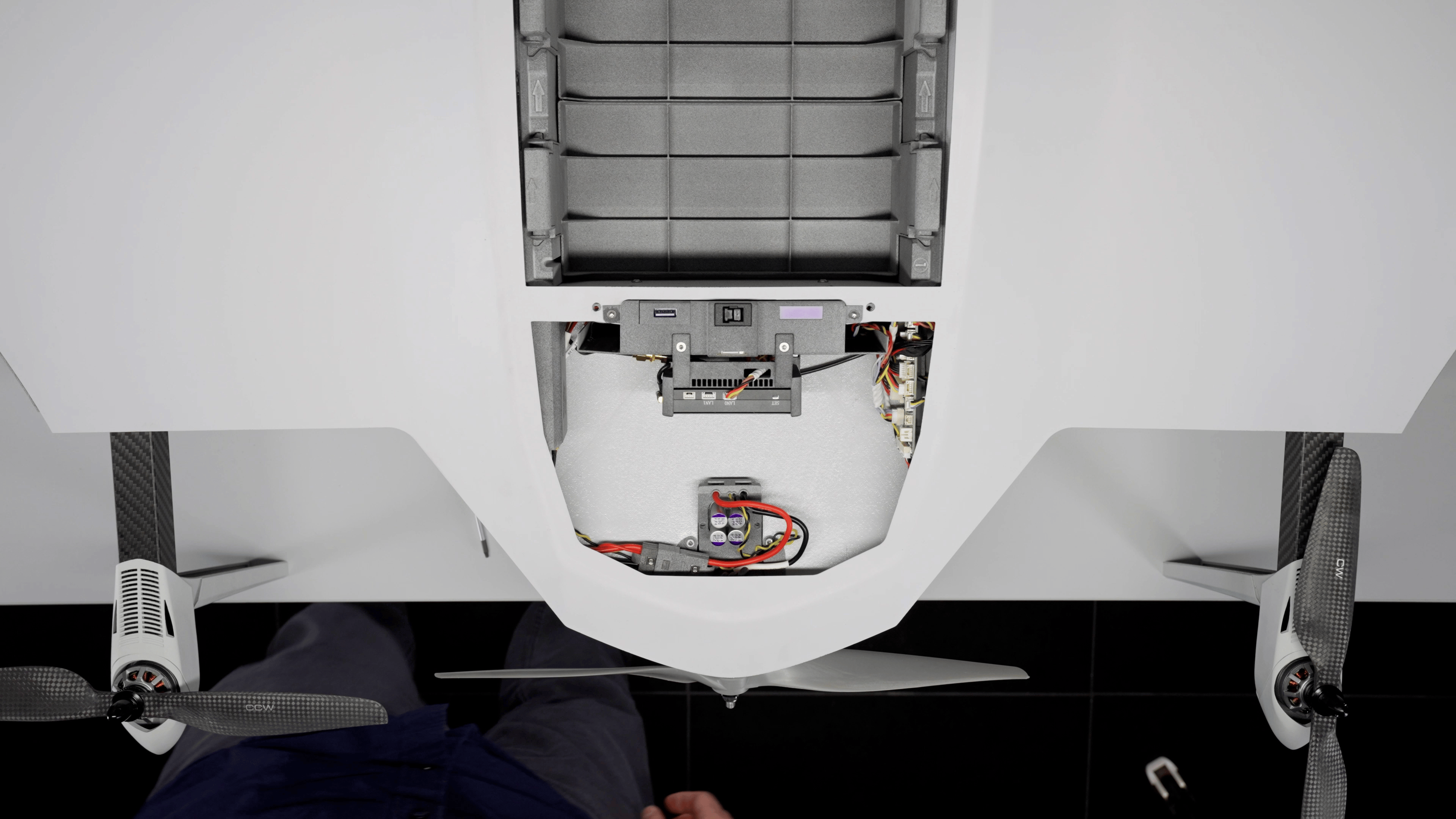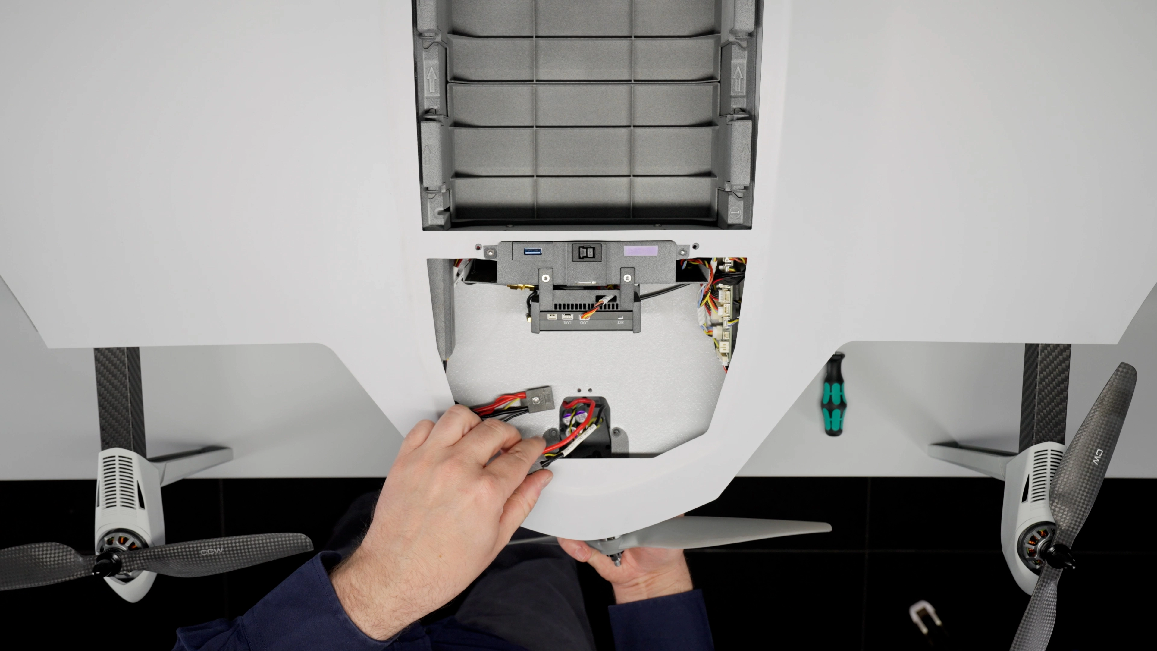 17. Connect the Pusher Motor Pod connectors and store the cable in the lower left corner of the fuselage.