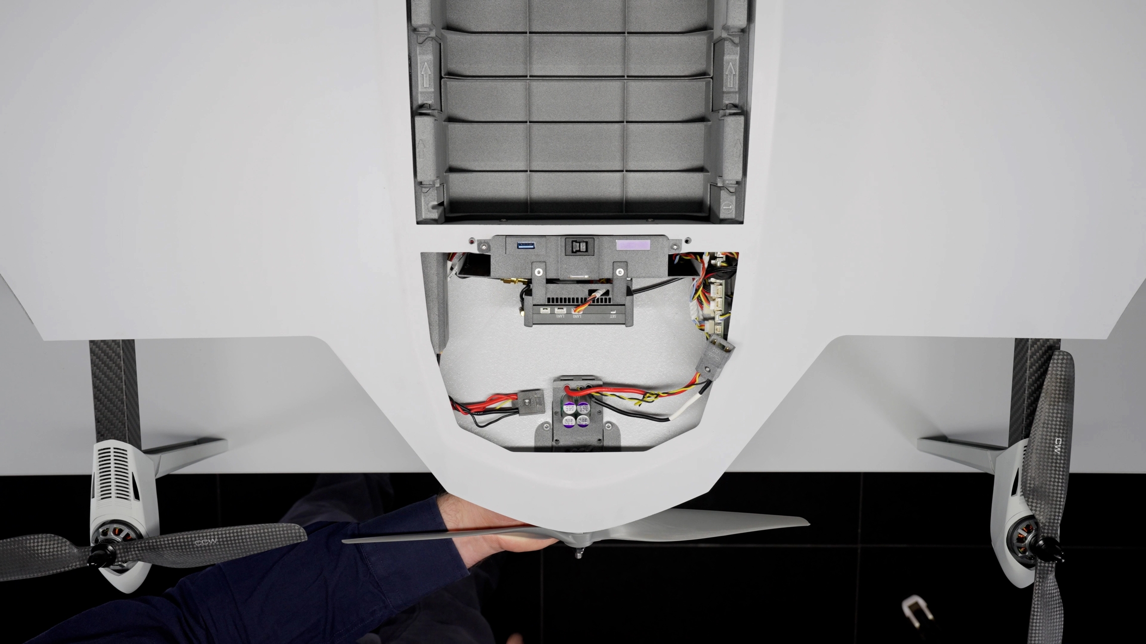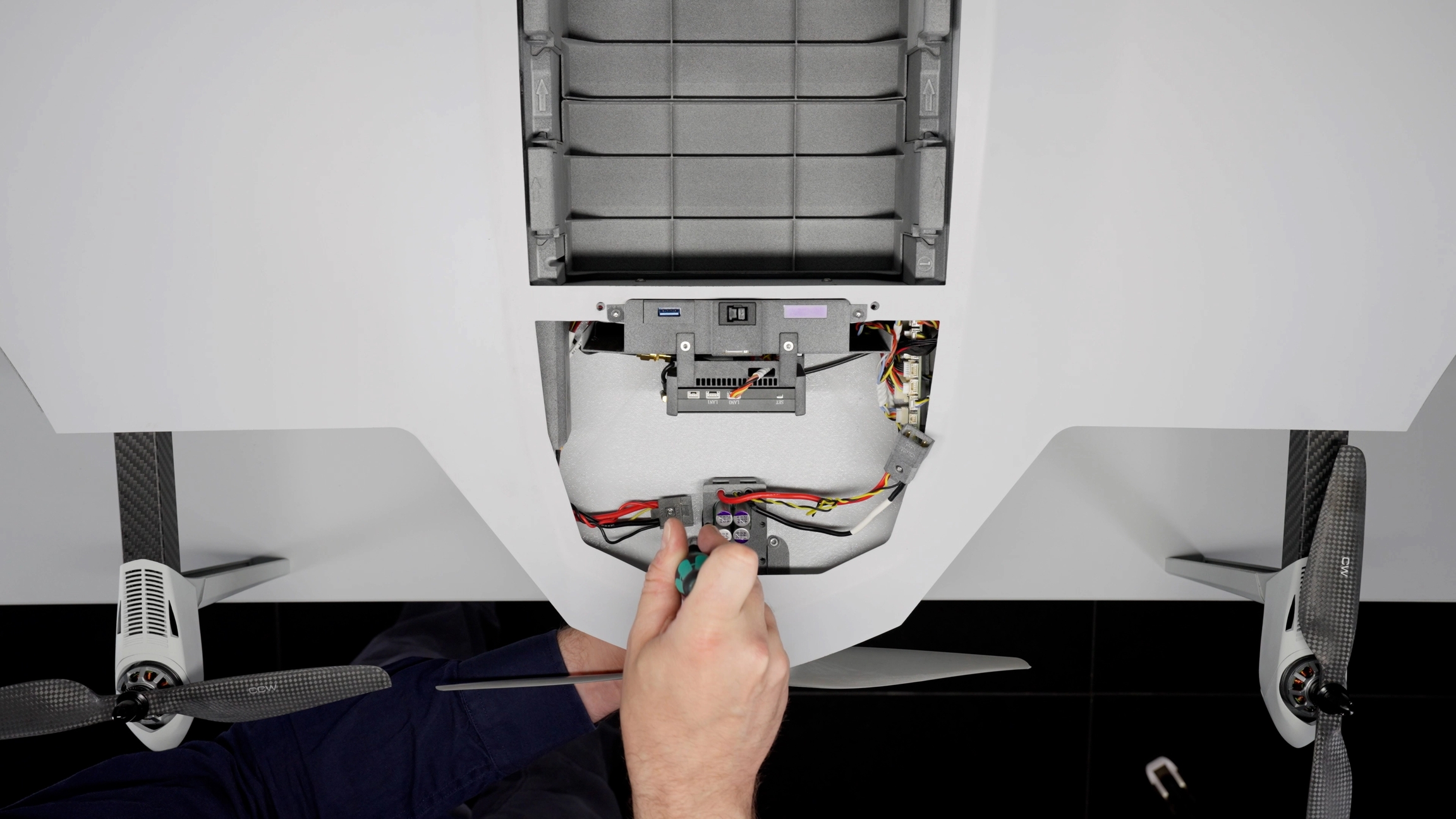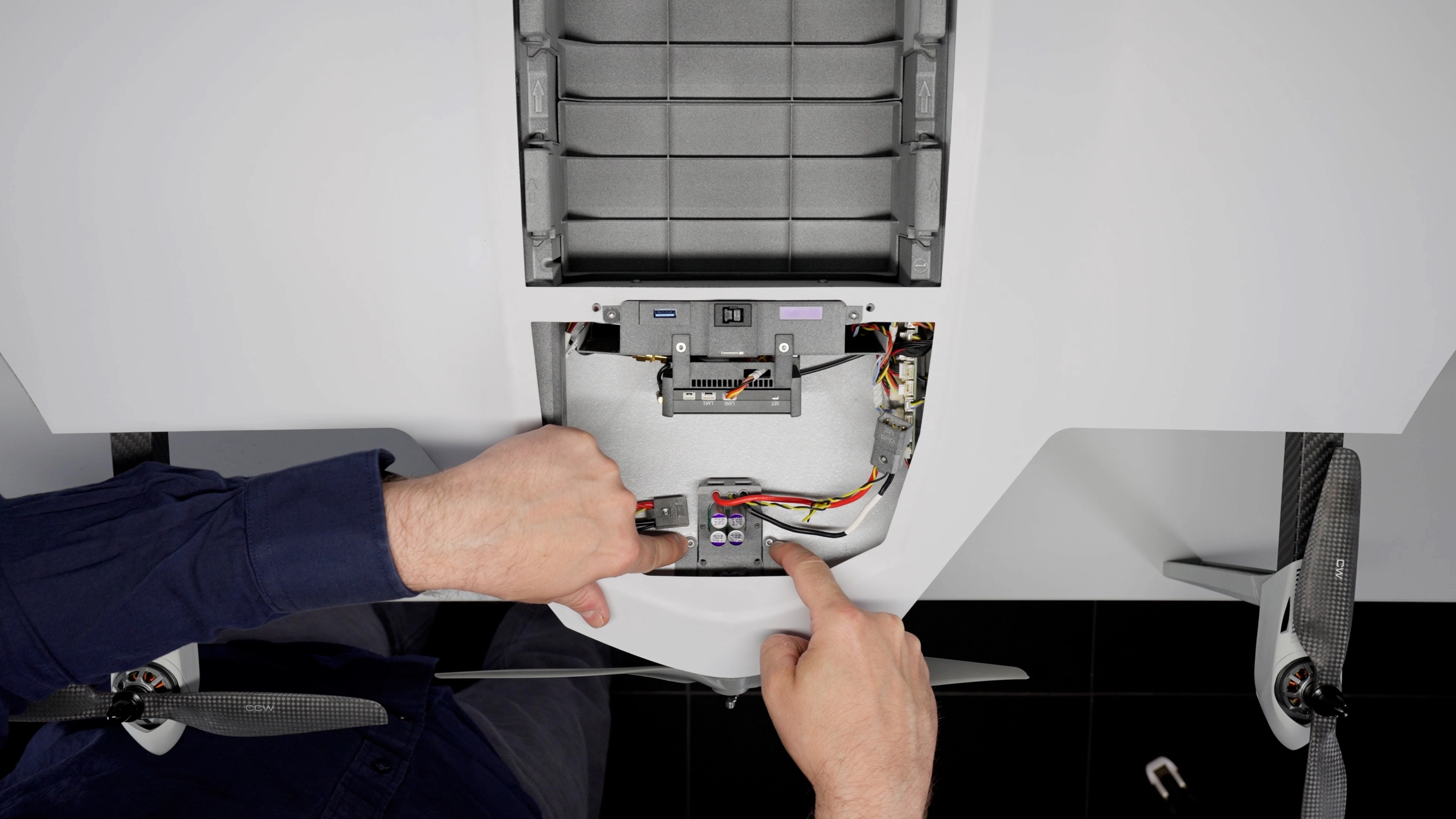 Connect the Pusher Motor Pod connectors and store the cable in the lower left corner of the fuselage.