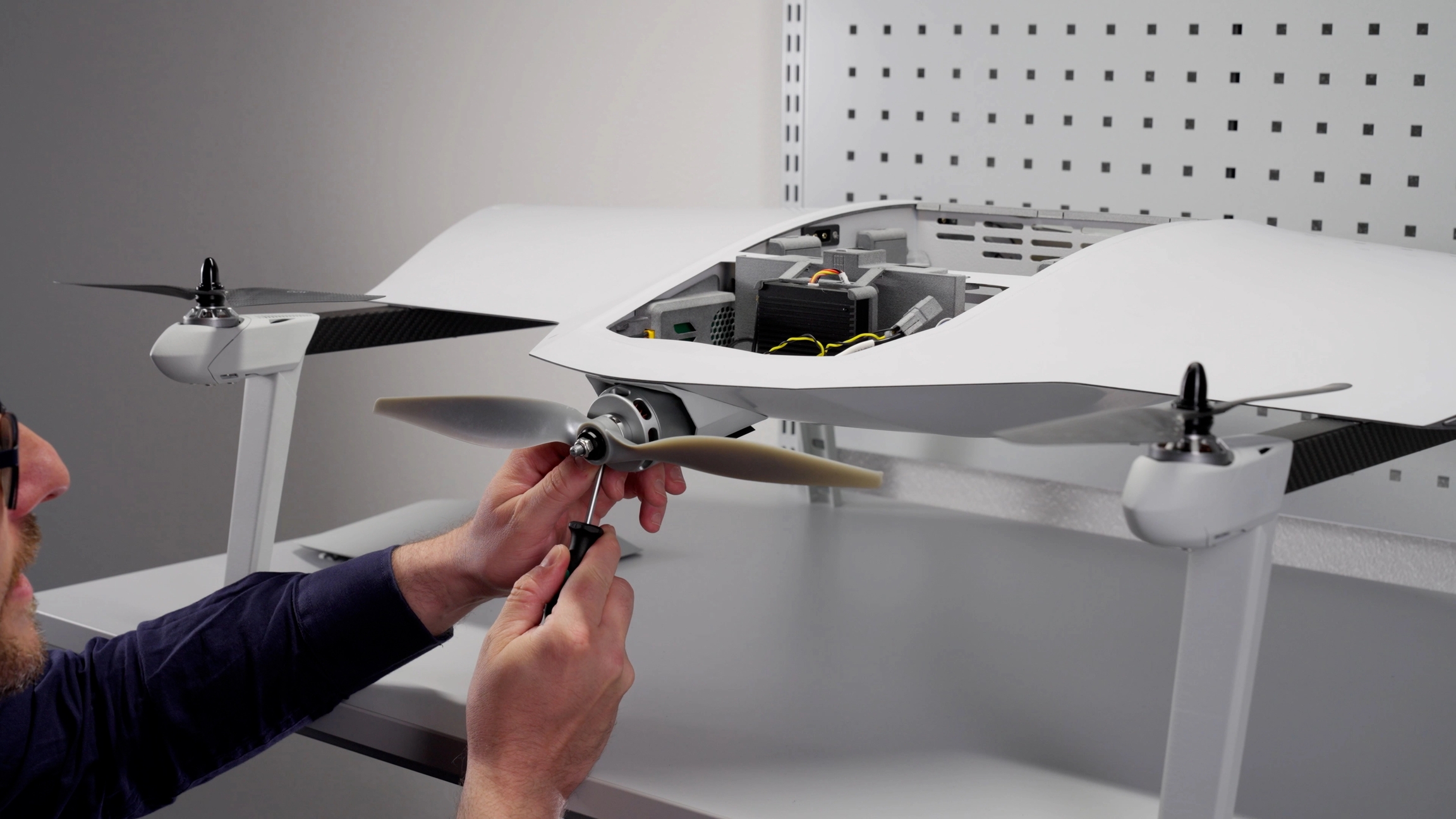 Pull the Pusher Motor Pod slightly towards you and then down, away from the opening. Take the connector of the Pusher Motor Pod and guide the cable through the fuselage opening.