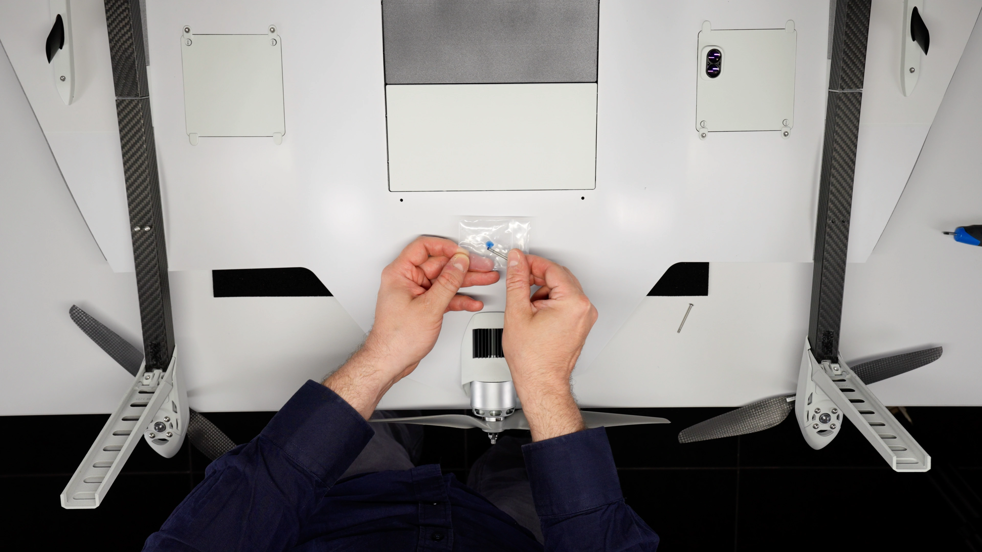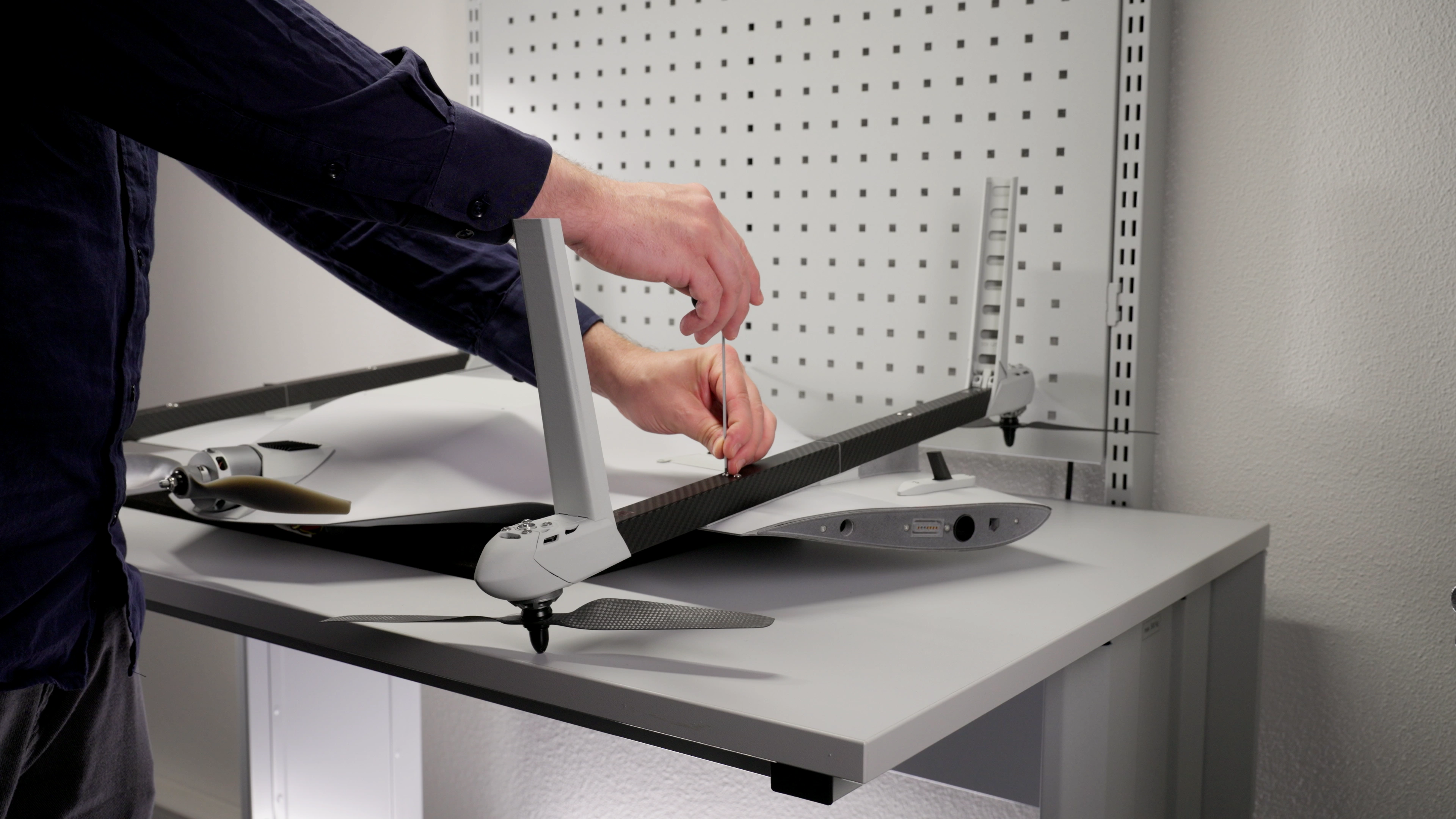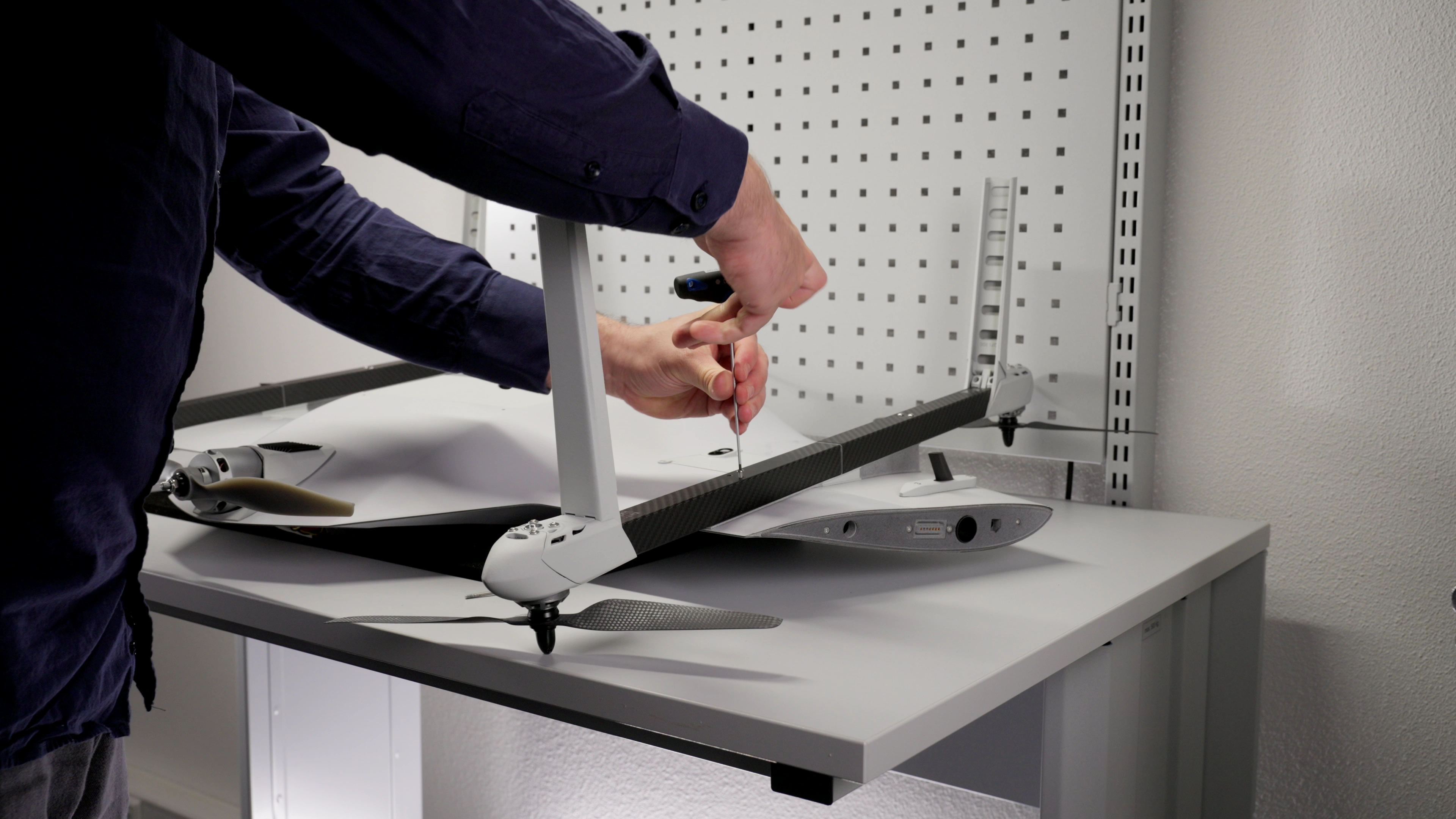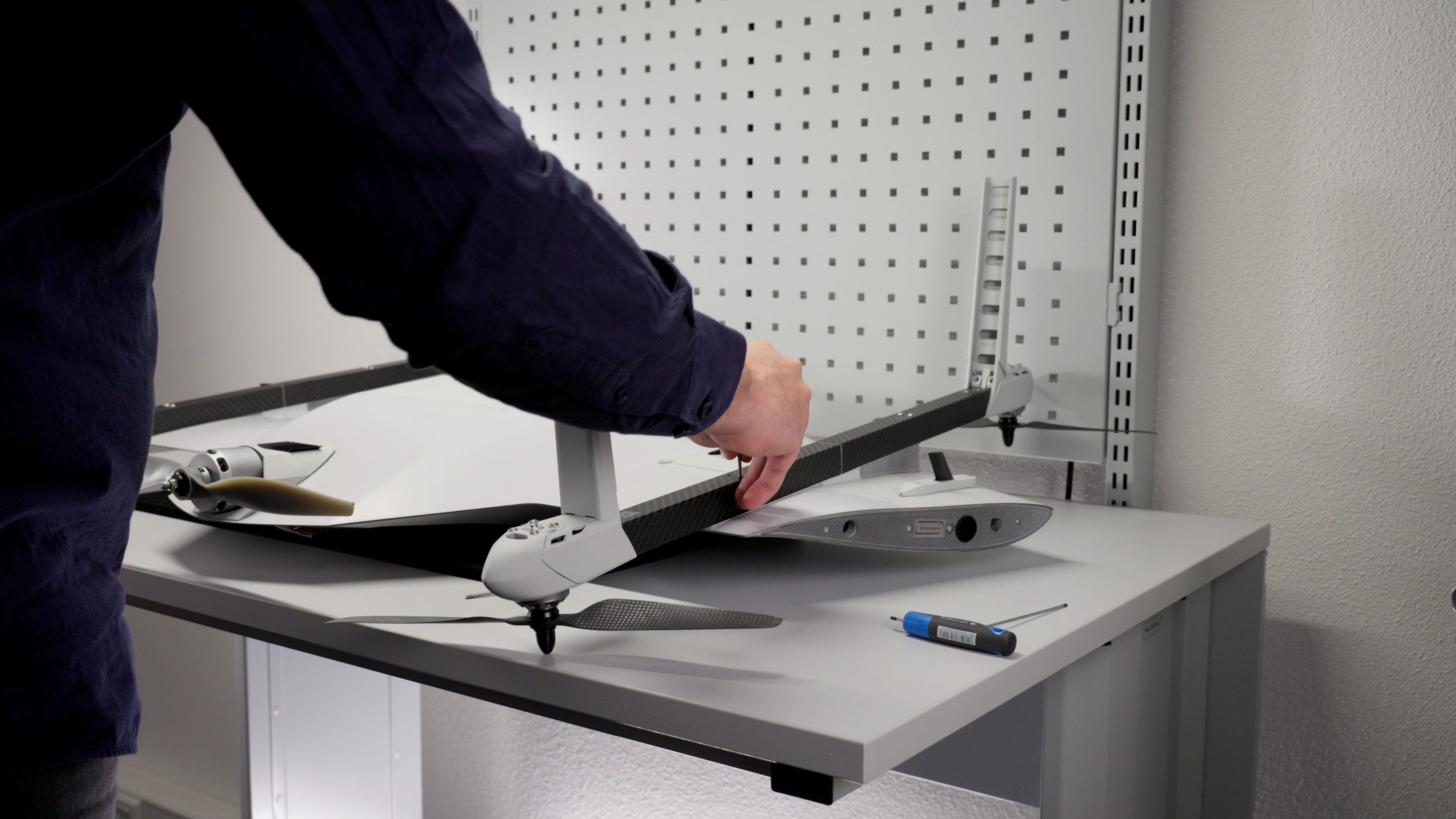 The VTOL arm is now installed. Ensure that it is securely aligned and properly set in place. Double-check that both screws are snug but not overtightened to avoid any damage. Repeat the process for the remaining VTOL arms if necessary.