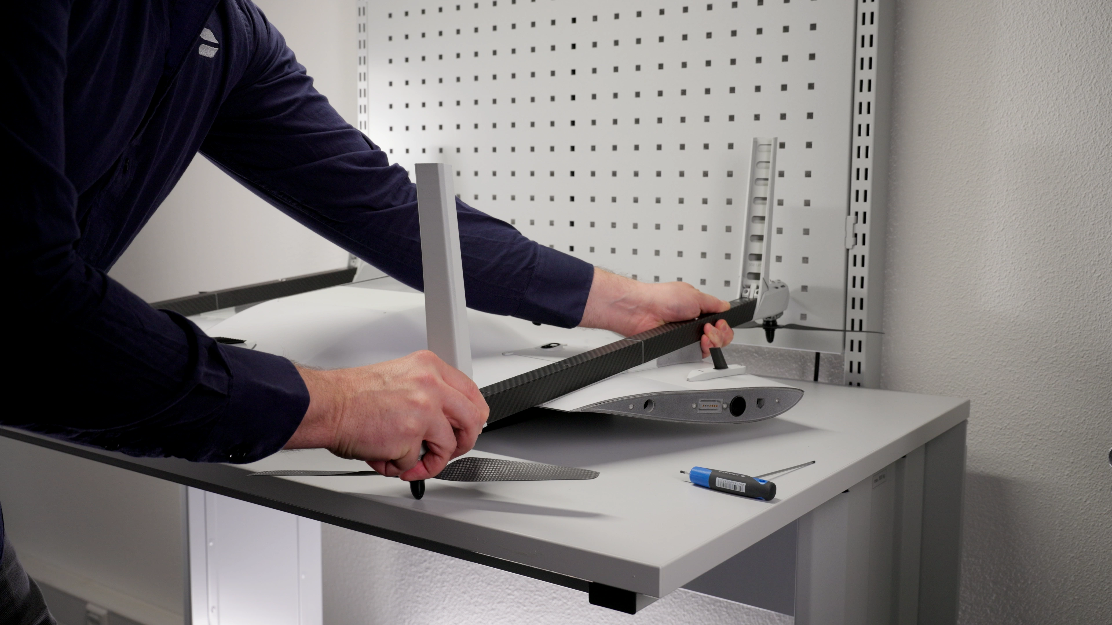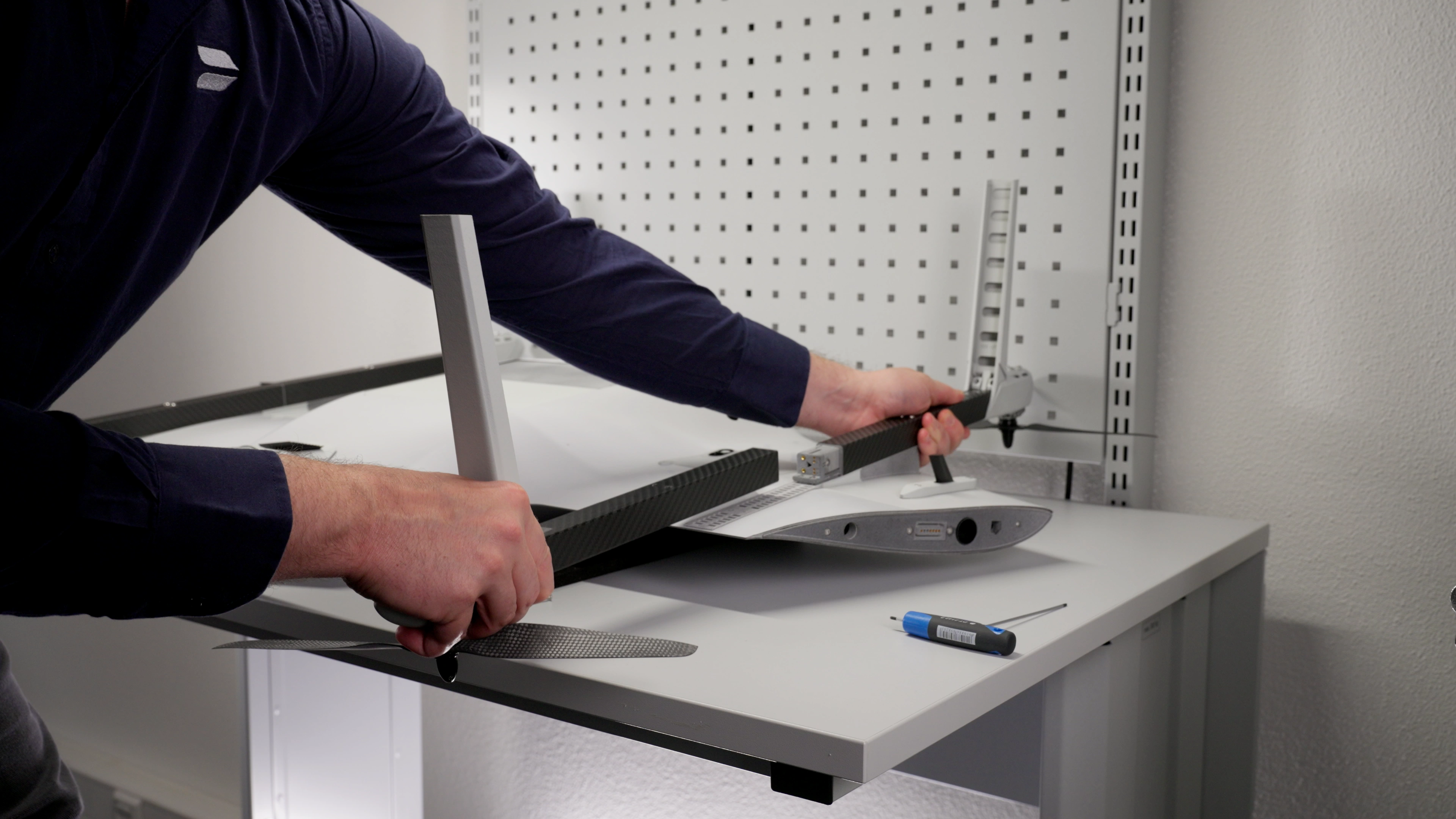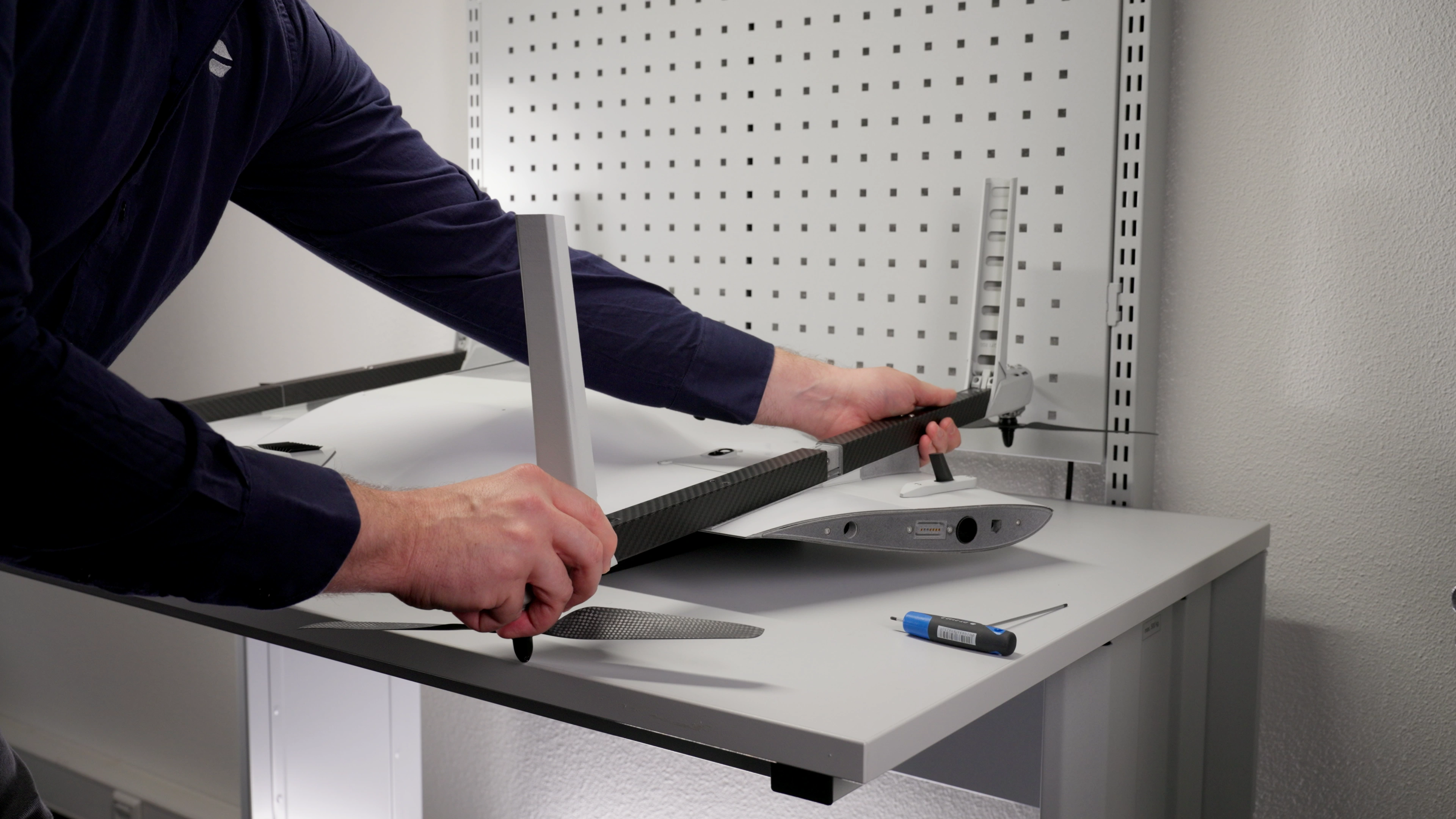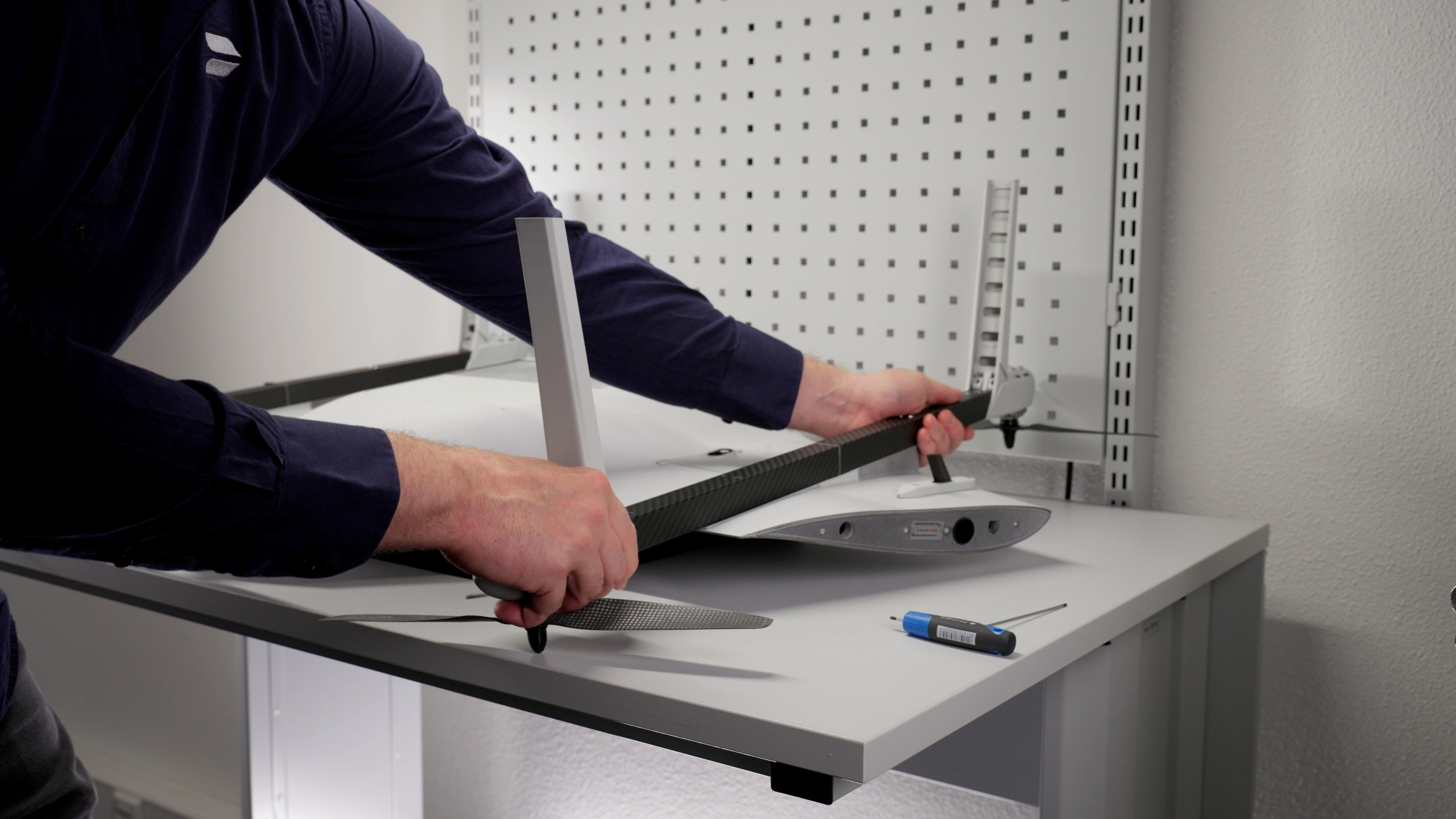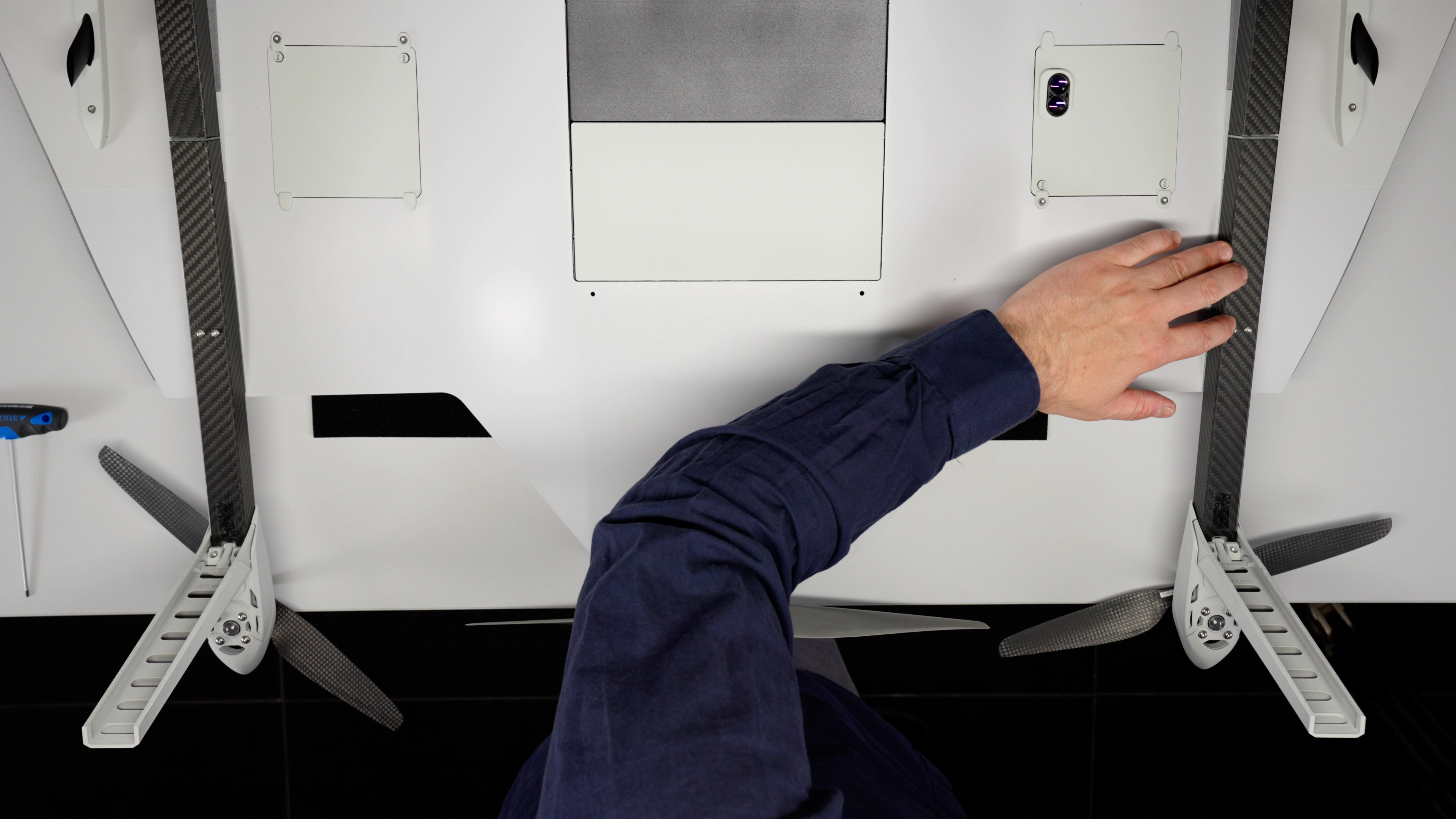 The VTOL arm is now installed. Ensure that it is securely aligned and properly set in place. Double-check that both screws are snug but not overtightened to avoid any damage. Repeat the process for the remaining VTOL arms if necessary.