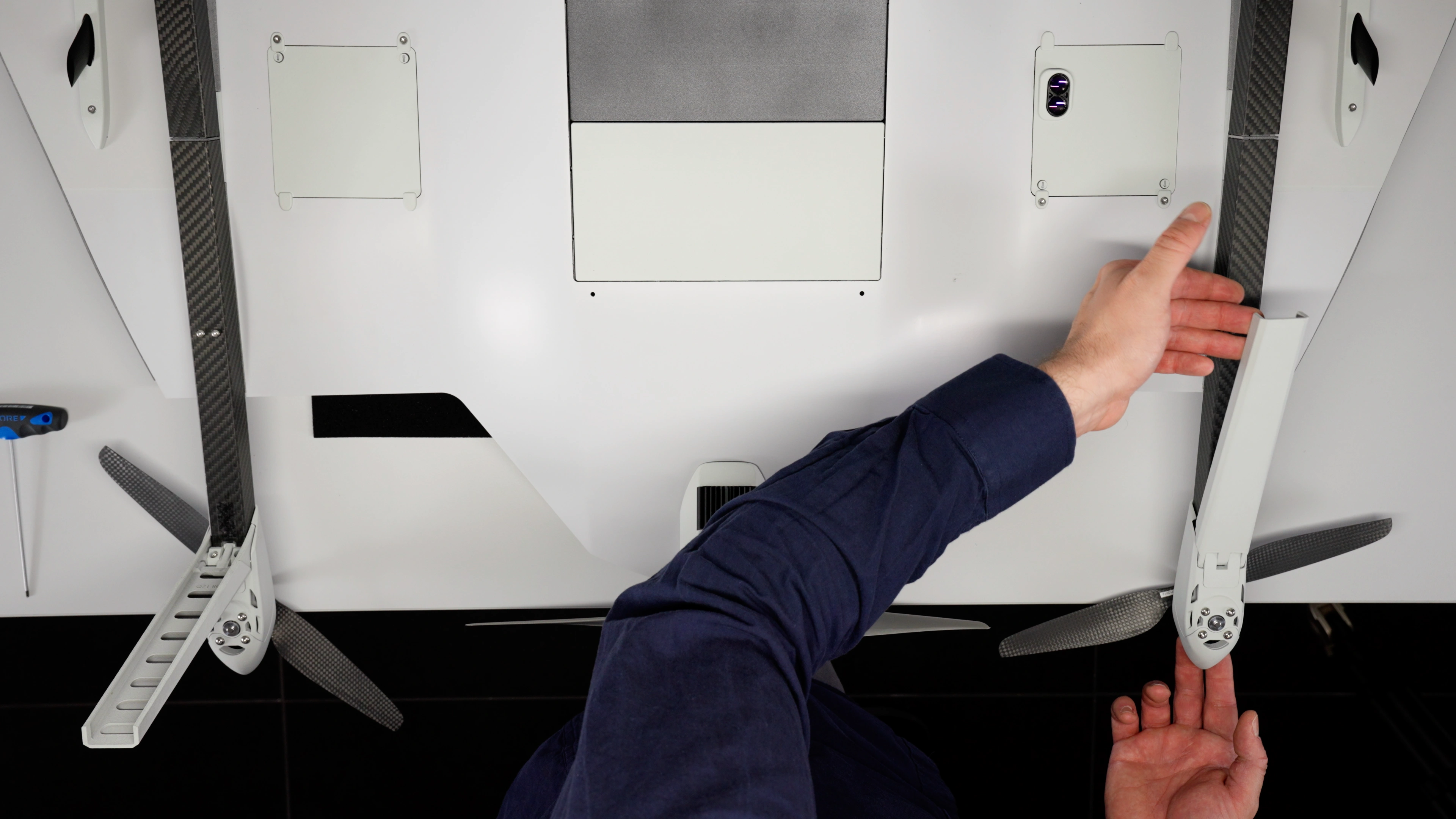 1. To remove the VTOL arm, two screws need to be loosened. To access the screw heads, the landing gear leg must be fully deployed. If the landing gear is retracted, it can be gently deployed manually.
