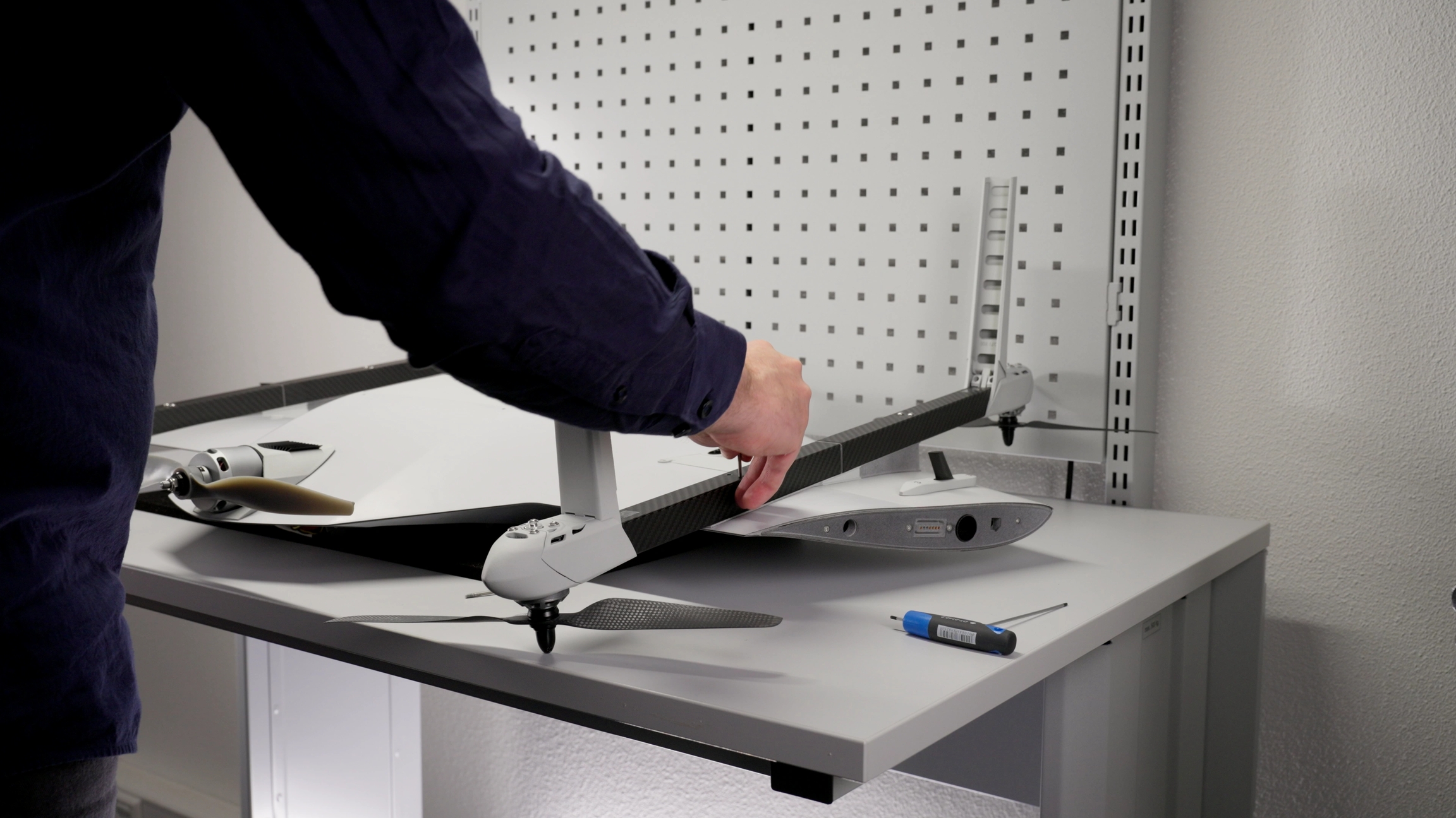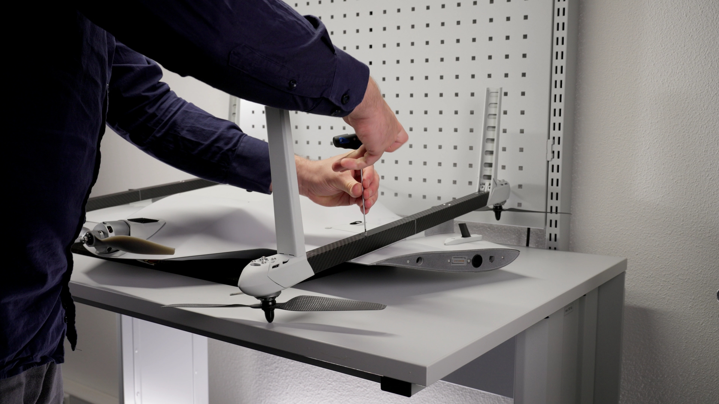 After removing the two screws, the VTOL arm can be detached. Hold the opposite VTOL arm with one hand for stabilization and pull the lower VTOL arm towards you in a straight line. Avoid wiggling from side to side or up and down.