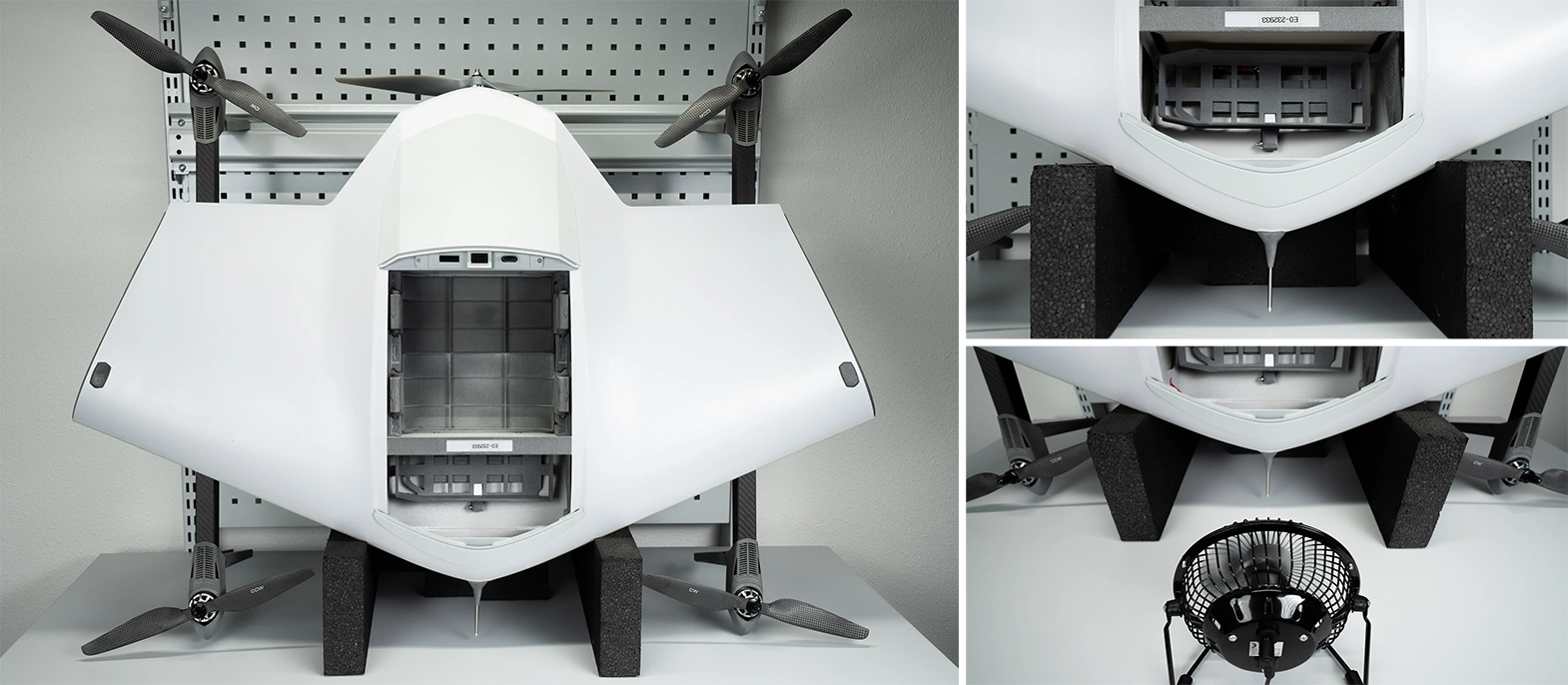 The Pitot tube is critical to an aircraft's airspeed measurement system. It is a small, forward-facing tube that measures the dynamic pressure of the air as the vehicle moves through it. This pressure is then used to calculate the vehicle's airspeed. The DeltaQuad Evo's Pitot tube is located on the aircraft's nose, where it can capture undisturbed airflow. Proper functioning of the Pitot tube is essential for accurate airspeed readings, which are crucial for safe flight operations.