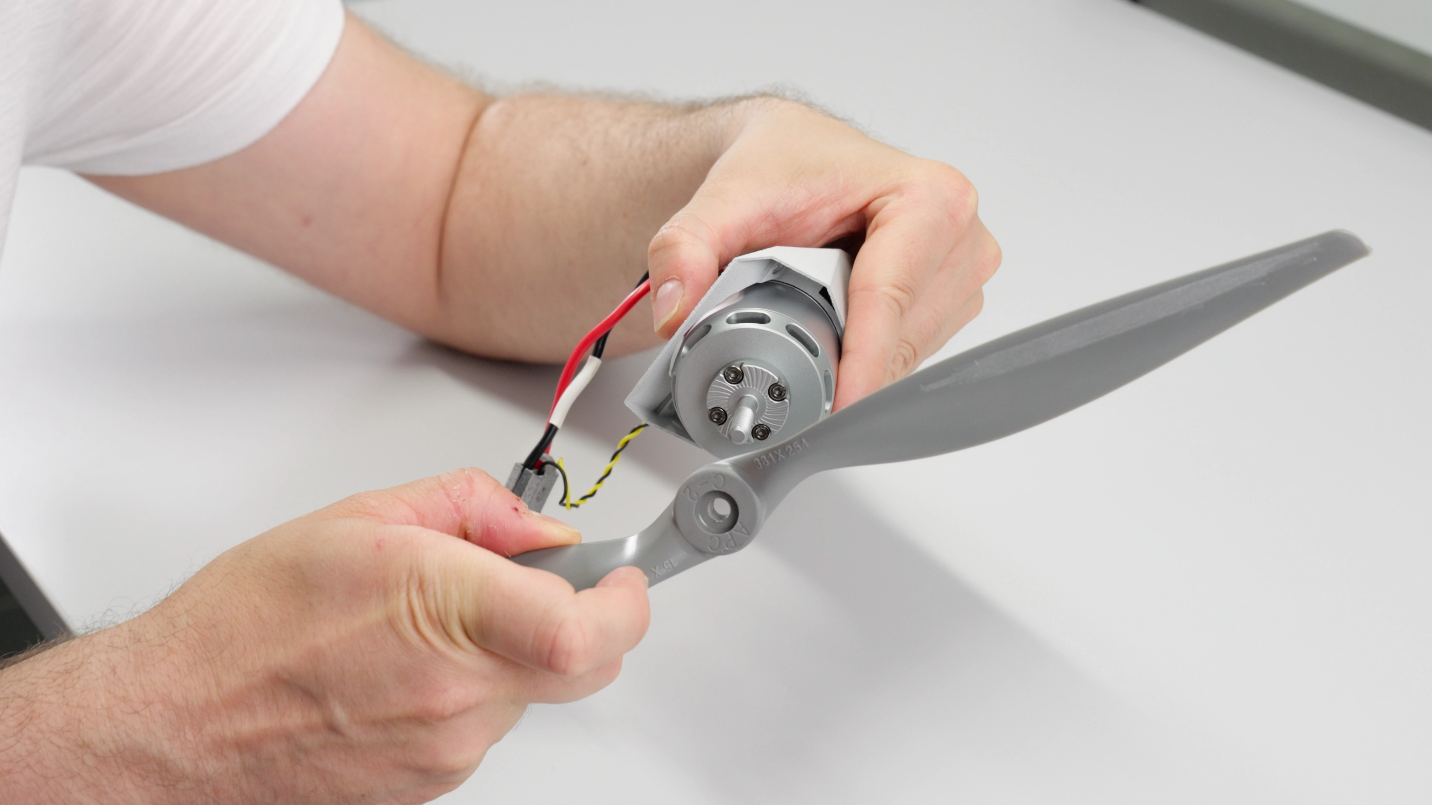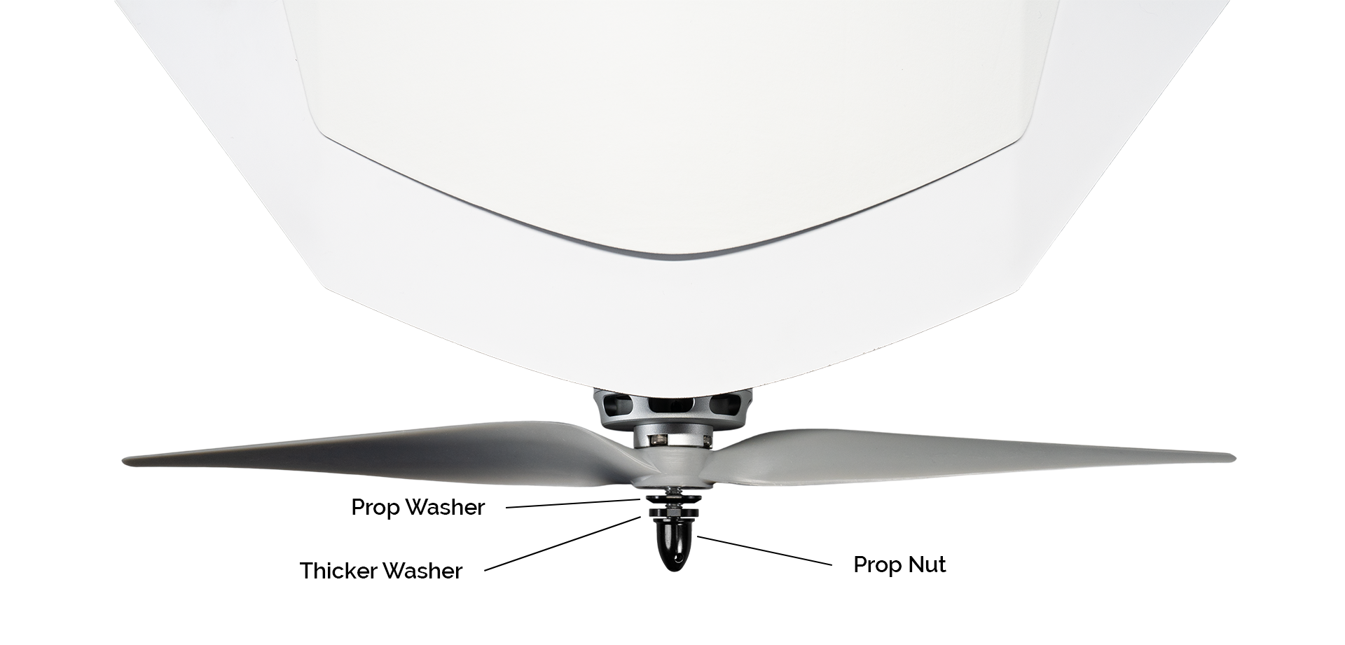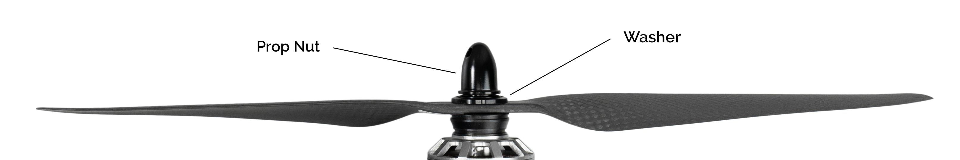 The bullet-type nut on the propeller adapters is self-tightening, meaning it tightens by turning in the opposite direction of the motor and propeller's rotation. This design ensures that the propellers do not become detached as the motor spins up.&#x20;