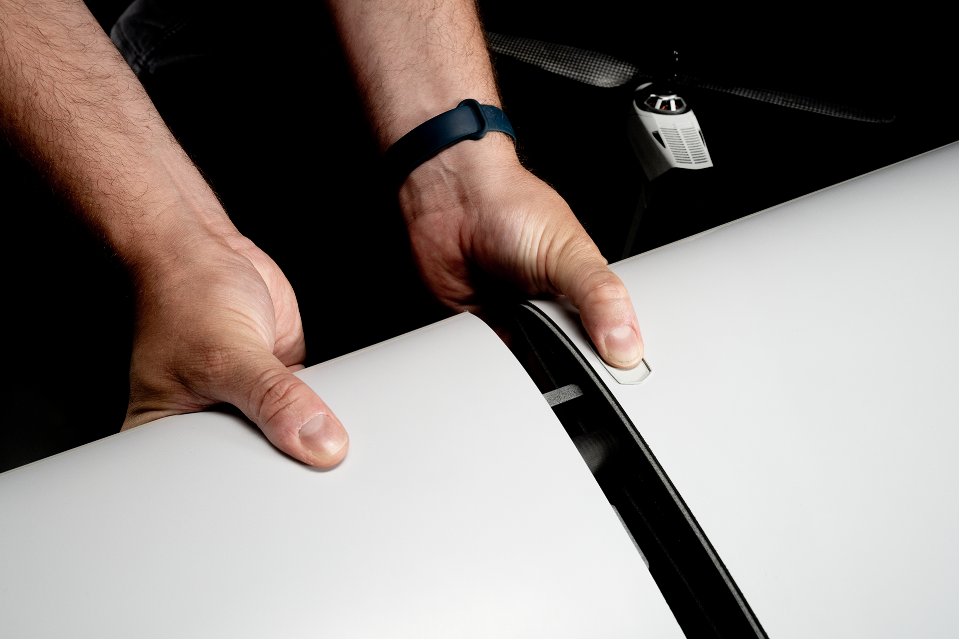 Slide the carbon spars of the wings into the corresponding blind holes in the fuselage.