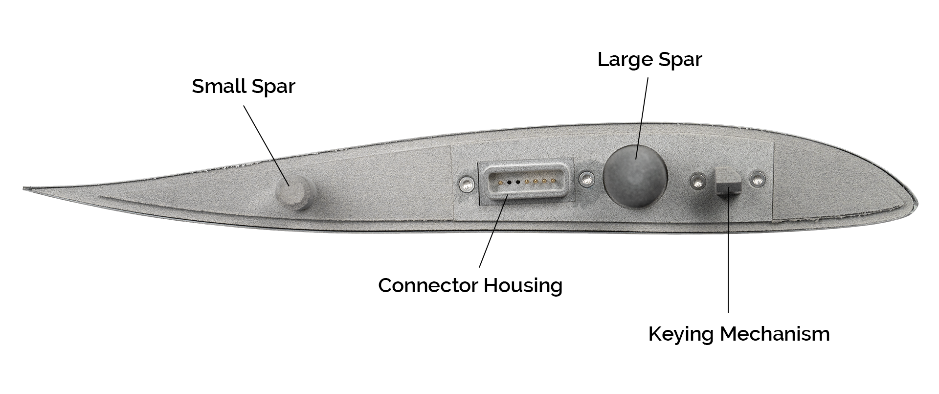 The wing has a large spar near the leading edge and a smaller spar near the trailing edge. In front of the large spar is a keying mechanism in the form of a cuboid.