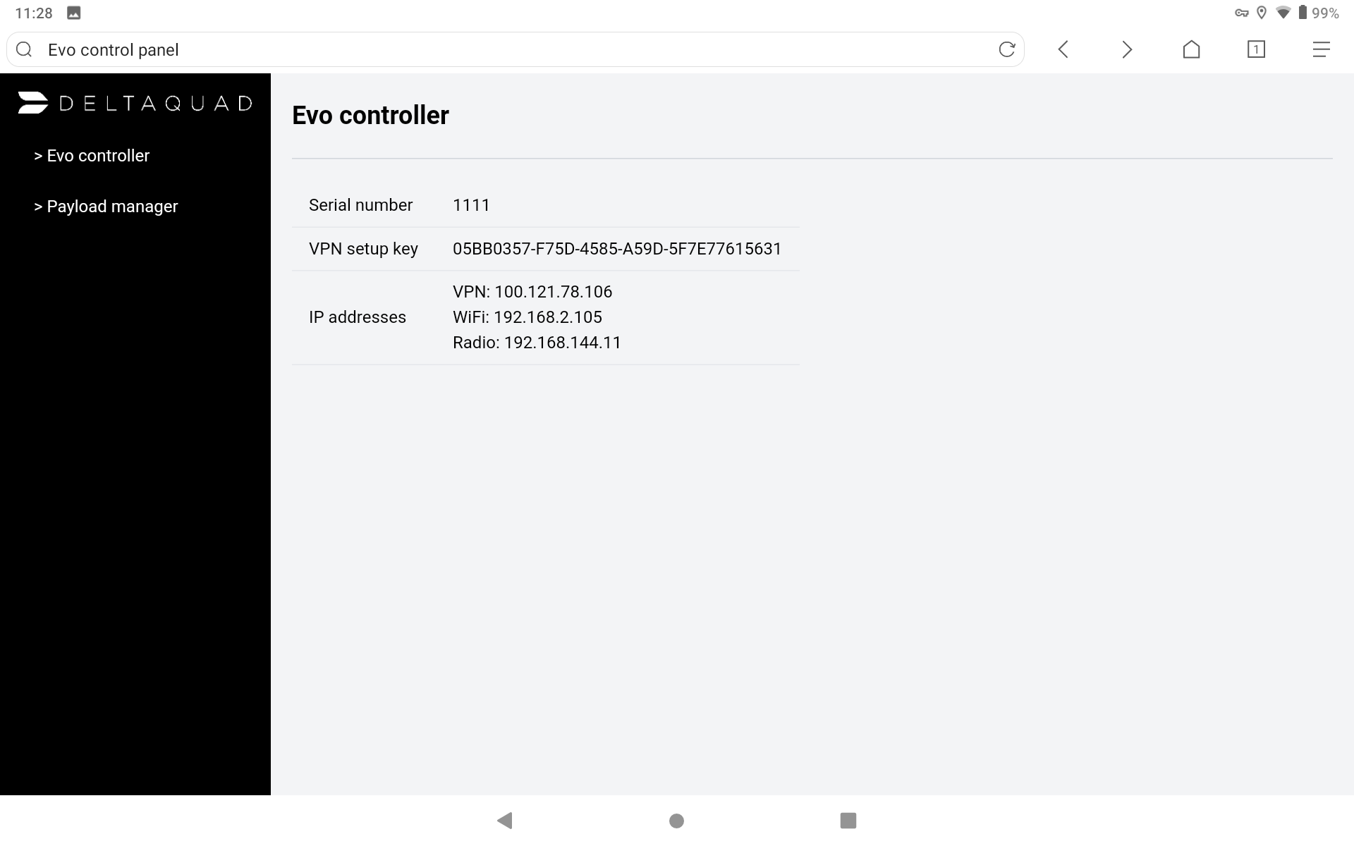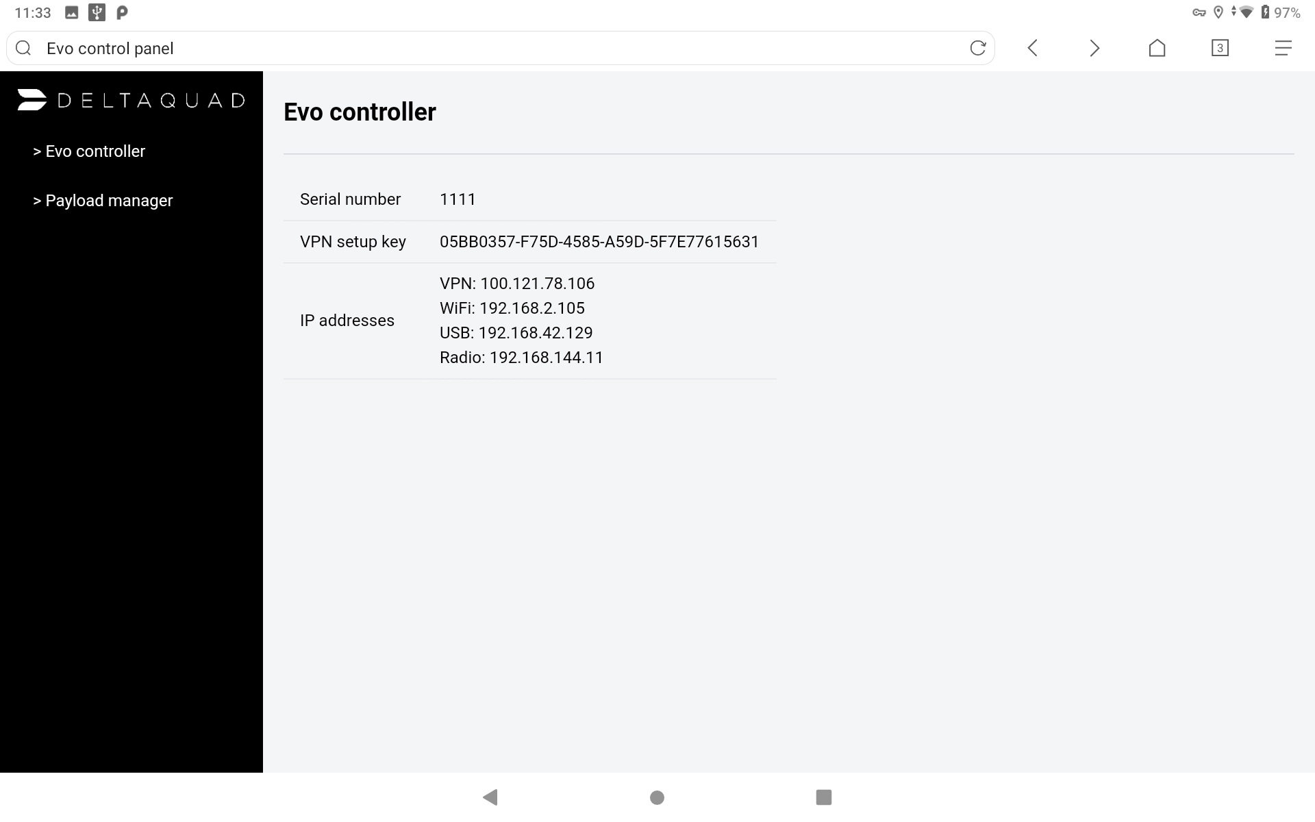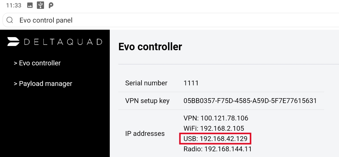 The Evo Controller window will open. Copy the USB IP address—in our case, 192.168.42.129.