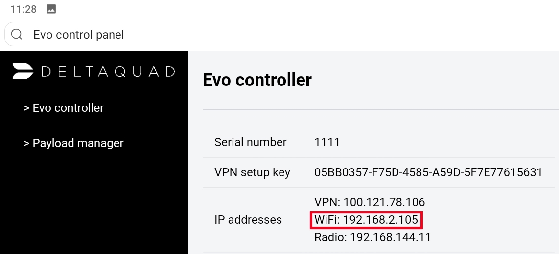 The Evo Controller window will open. Copy the WiFi IP address—in our case, 192.168.2.105.