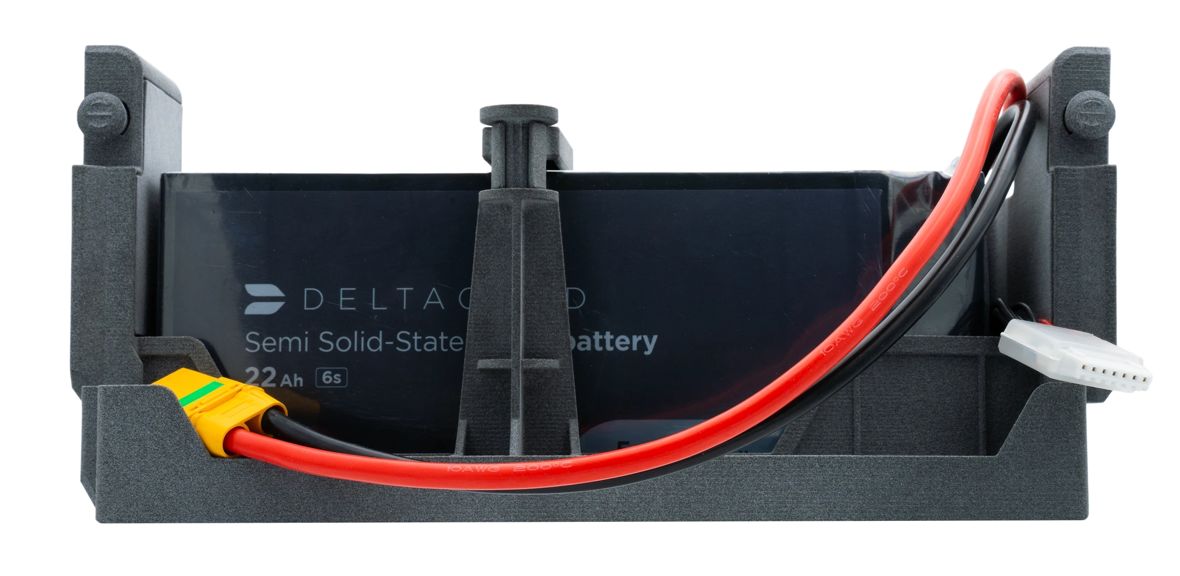 The auxiliary battery must be positioned to fit properly on the tray. The thicker power cables should exit from the top of the battery and run over it towards the XT90 socket of the DeltaQuad Evo.