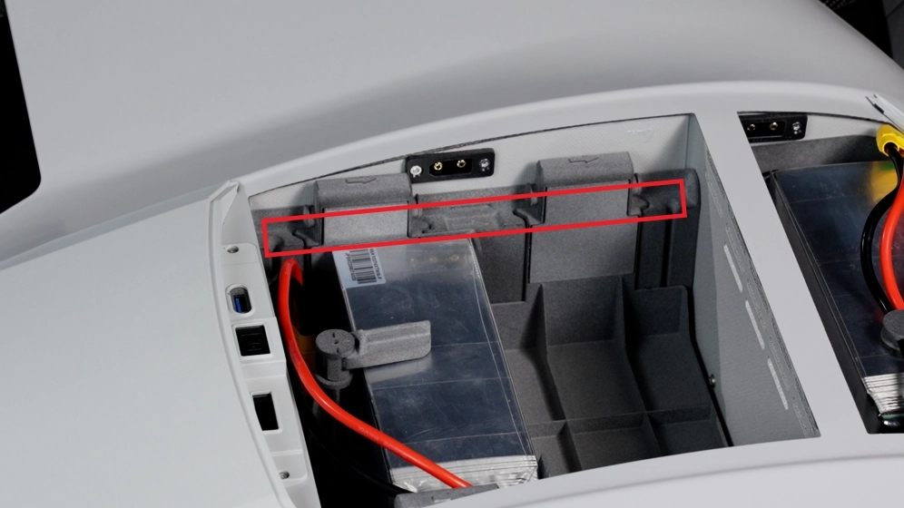 To extend the flight time and overall mission range of the DeltaQuad Evo, the auxiliary battery can be installed in the payload bay alongside the main battery.